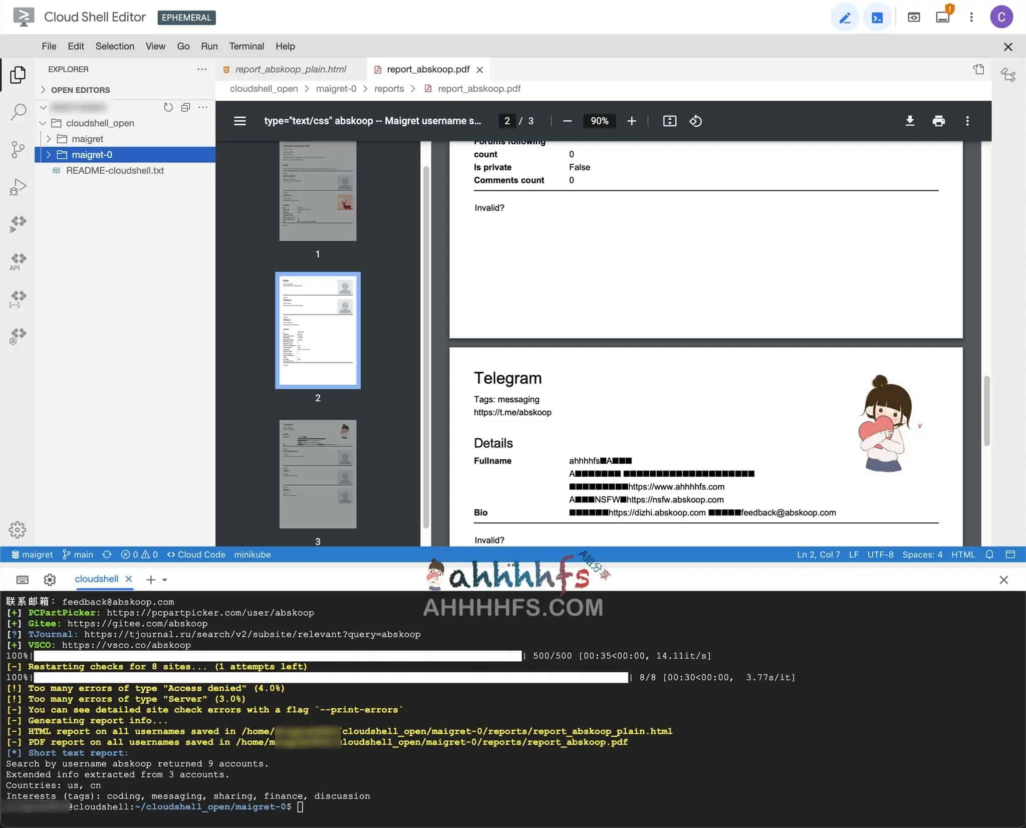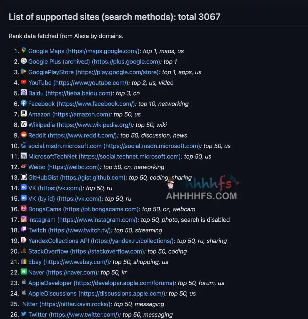 A姐体验了一下发现,用人话总结一下大概是这样的,这个工具是一个python库,可以从3067(目前)网站匹配查找存在的用户社交账户资料页,国内外的网站都有,搜索结果返回符合的用户名的社交页面资料链接,用户名不支持中文(大概是数据库不好存的缘故),要说明的是,你查找的用户名可能别人也在用,所以结果可能会出现陌生的用户,总结了一下用法。