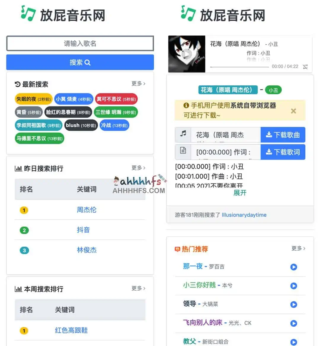 放屁音乐网,是一个全网MP3付费歌曲免费下载和在线播放的网站,放屁音乐网免费提供在线音乐搜索,可以在线免费下载全网MP3付费歌曲、流行音乐、经典老歌等。曲库完整,更新迅速,试听流畅,支持高品质、无损音质等等,而且还无广告,低调用。
