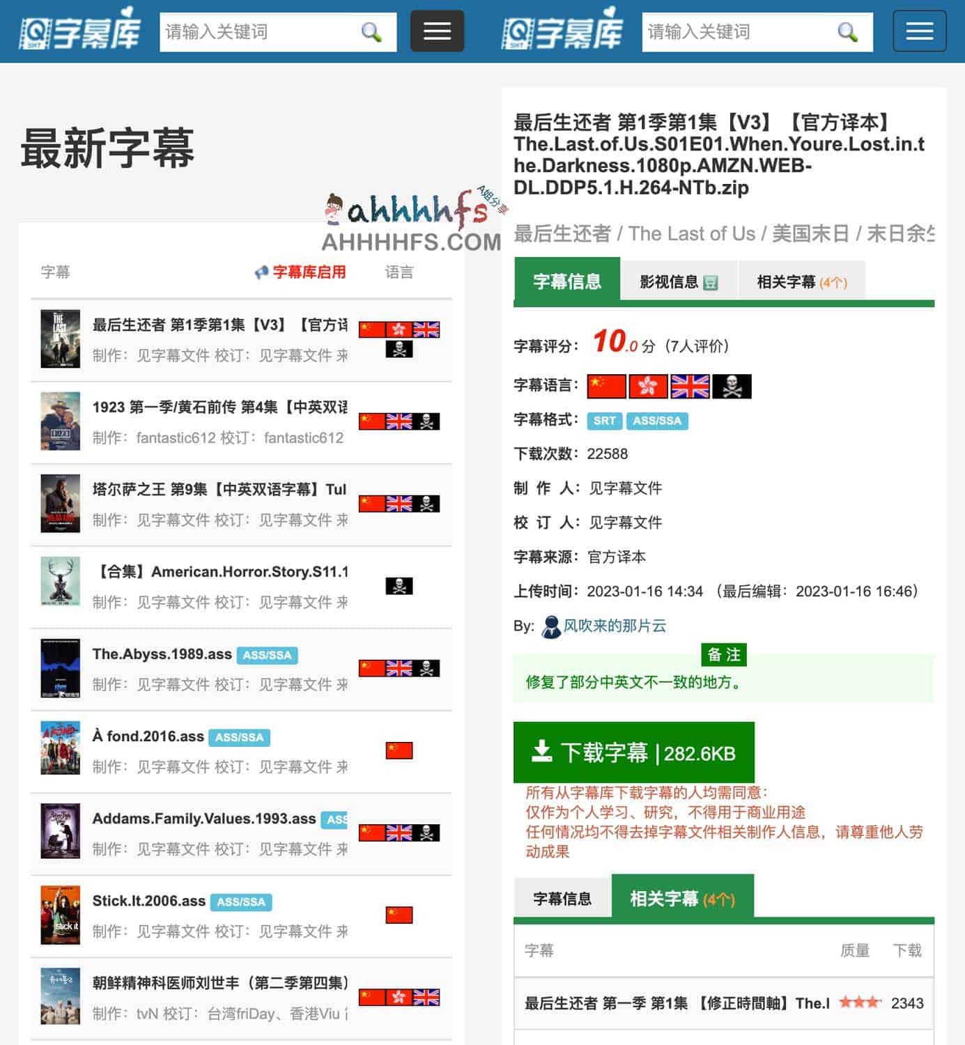 字幕库,一个免费的影视字幕下载网站,网站免费提供各种流行热门影视、美剧的中文字幕、中英等字幕,而且网站字幕字幕更新比较快,对于一些刚出的影视资源,来不及配字幕的,又想记着看的同学,可以找这种在线字幕下载网站,直接搜索影视名称即可下载影视字幕。