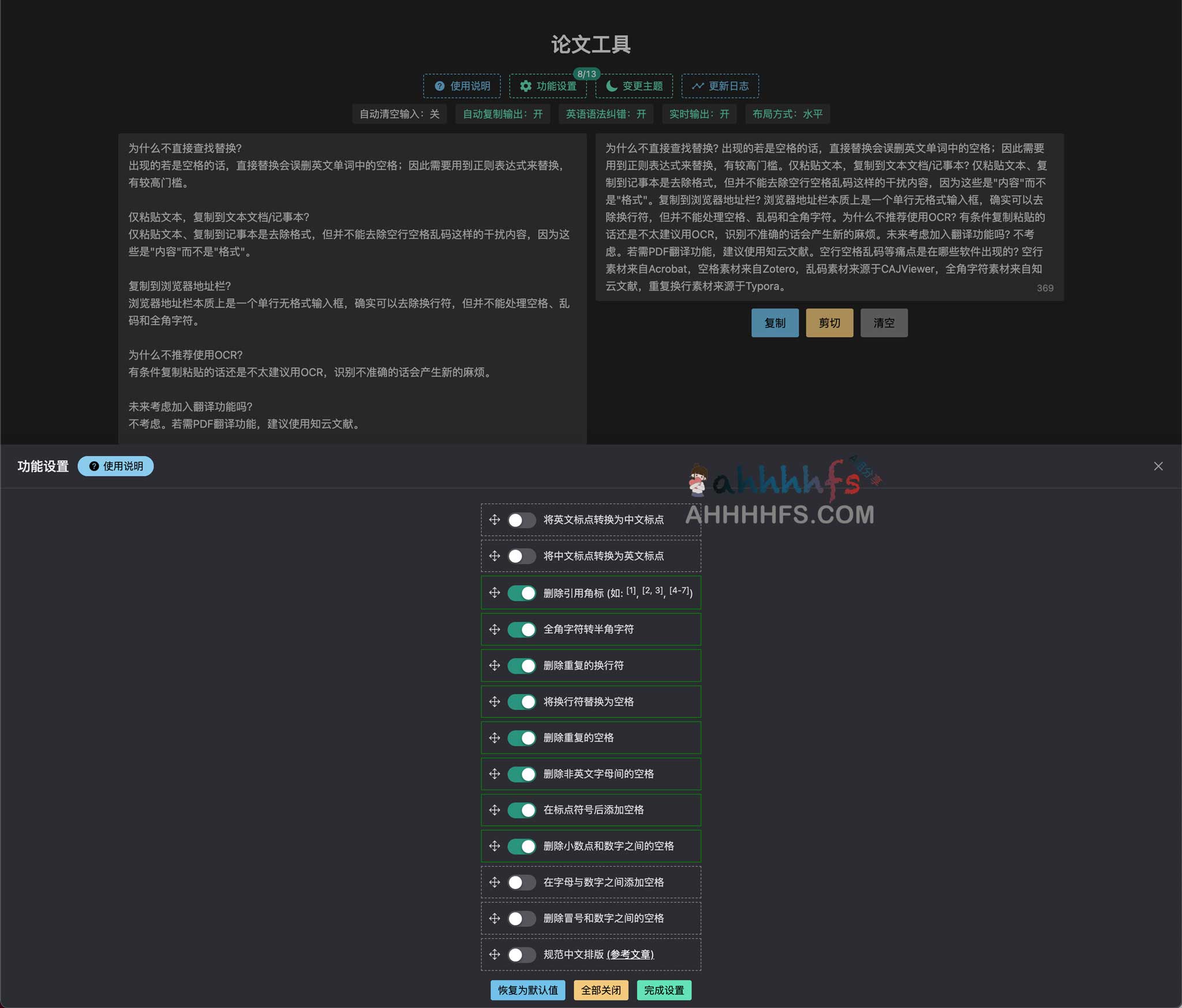 论文工具,一款免费实用的论文工具智能删除空行空格乱码提供英语语法检测,平常在复制PDF中的文字时,有时会出现莫名其妙的空格、换行、全角字符或乱码。如果手动删改,工作量巨大;如果直接全文替换,可能会误删英文单词间的空格。因此,可以使用本程序去除空行空格,而如果你在电脑上在线使用,在输入英文时,工具将为你检查语法 (基于Grammarly)。