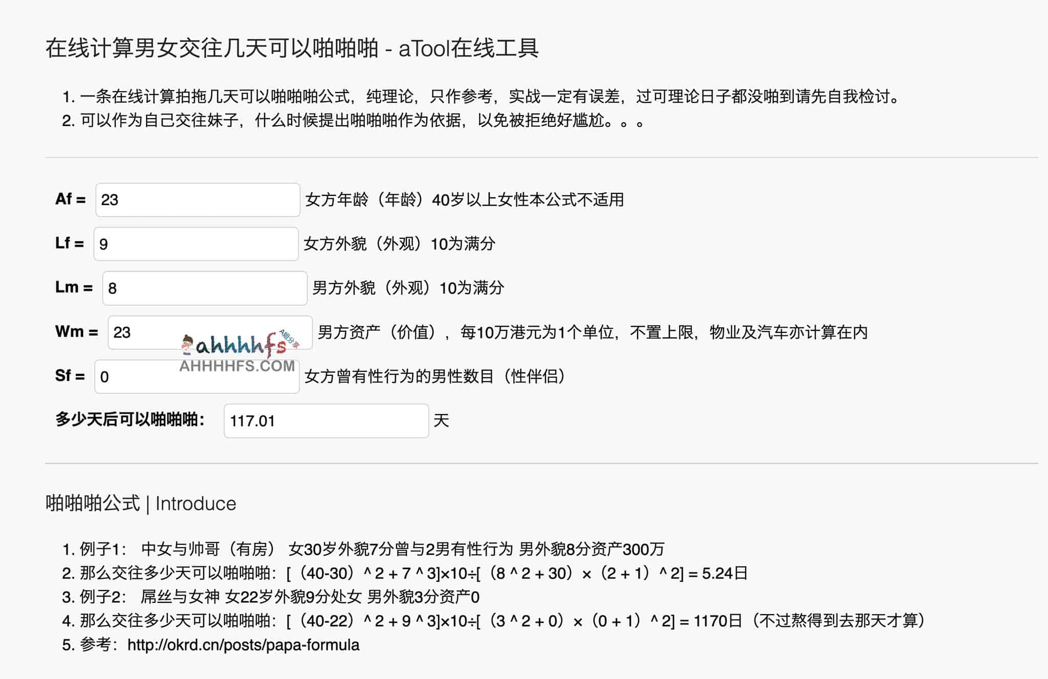 aTool在线工具,一个在线的工具箱网站,目前网站收集了很多使用的工具,例如多媒体工具、站长工具、开发者工具和便民工具,有细心的网站发现了一款实用的工具:在线计算男女交往几天可以Pa,纯理论,只作参考,实战一定有误差,仅供娱乐,感兴趣的可以前往试试。