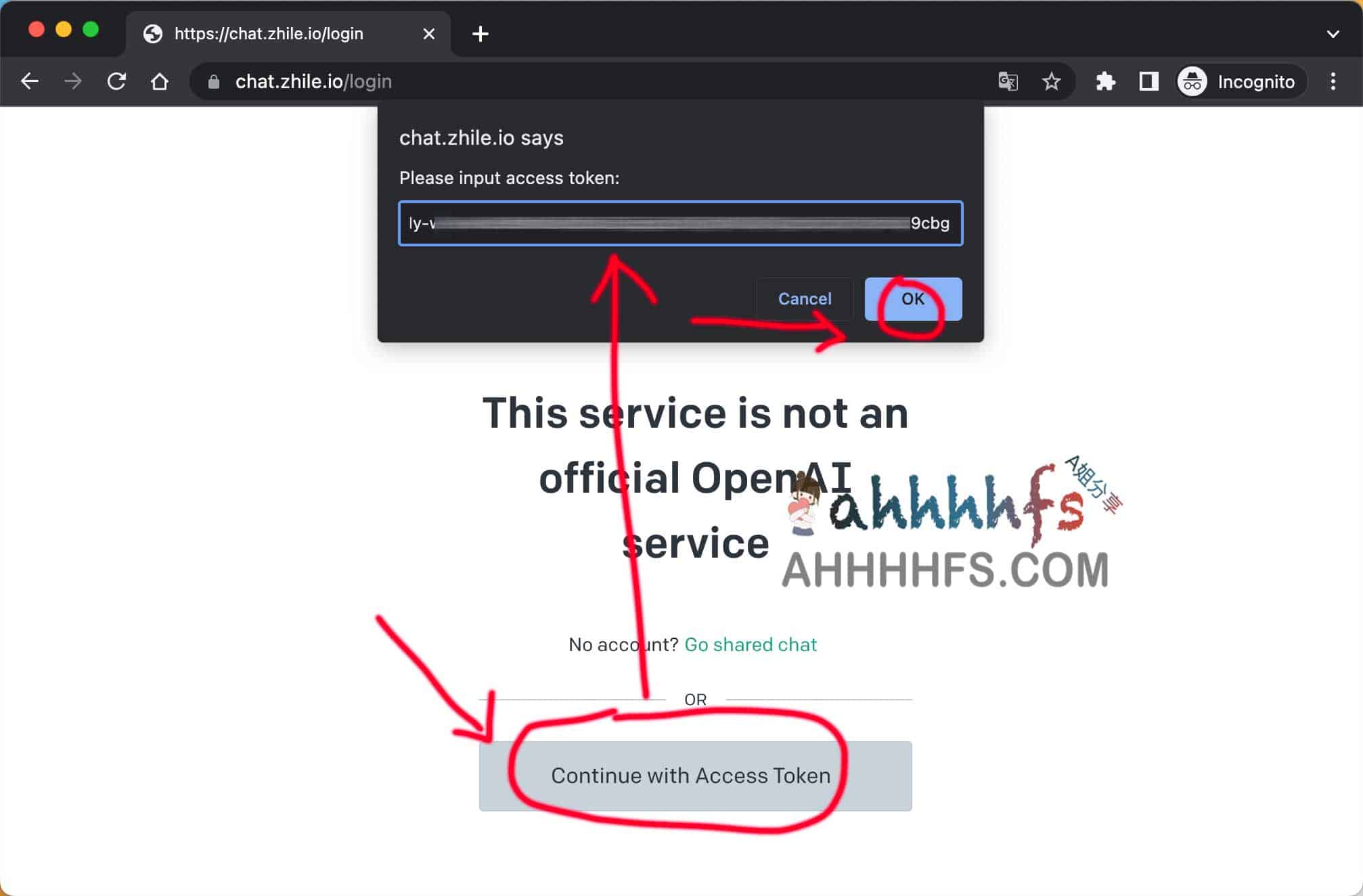 接着点击 https://chat.zhile.io,然后点击 Continue with Access Token,把刚刚复制的accessToken粘贴,点击ok即可