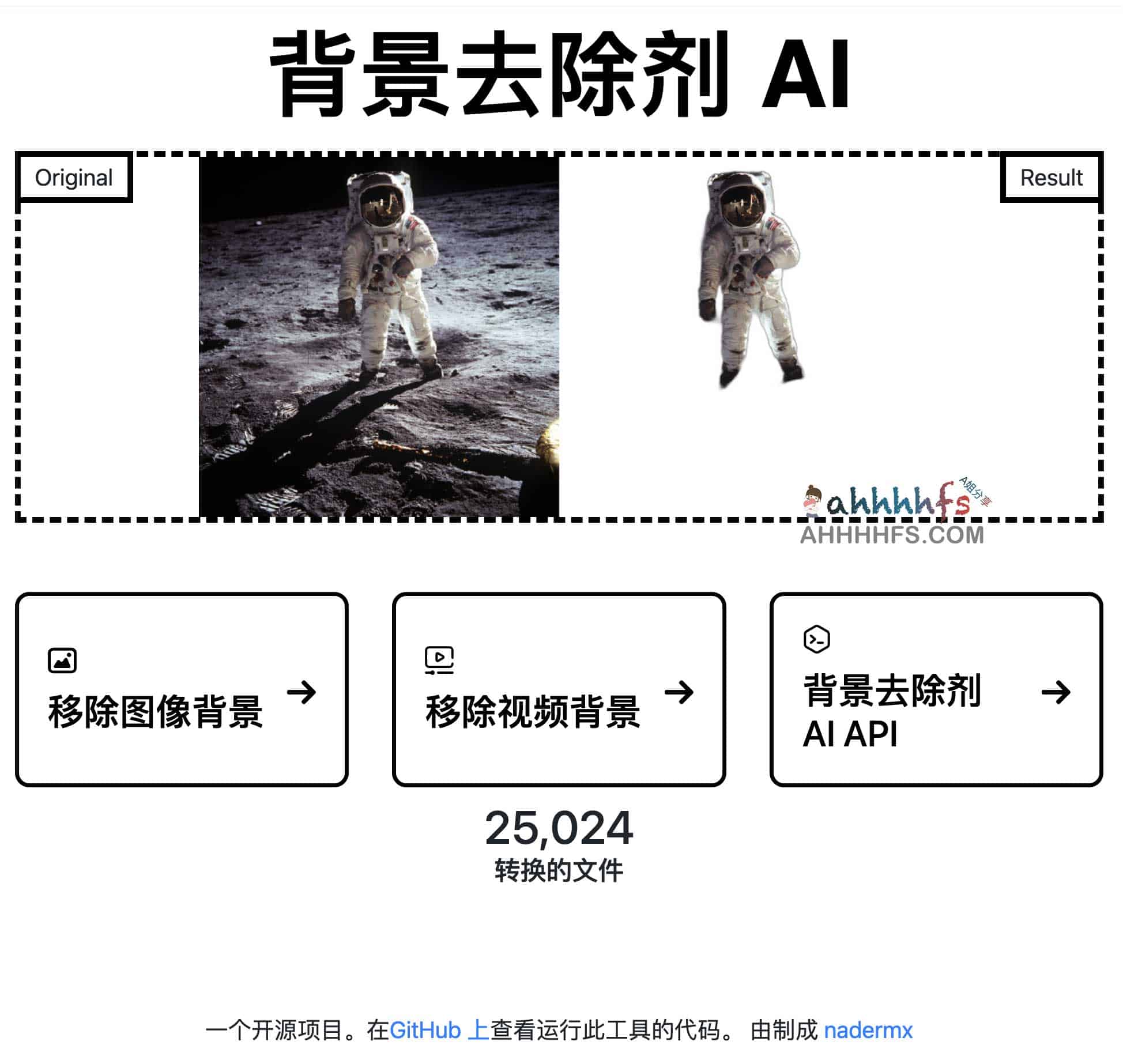 Background Remove,是一个命令行工具,可让你使用 AI 和免费开源的简单命令行界面从图像和视频中删除背景,BackgroundRemoverAI.com 使用机器学习(也称为人工智能)从内容中删除背景,项目开源,带有 API,演示站由nadermx制作,运行要求python> = 3.6版本,感兴趣的同学可以到演示站体验,或者自行搭建。