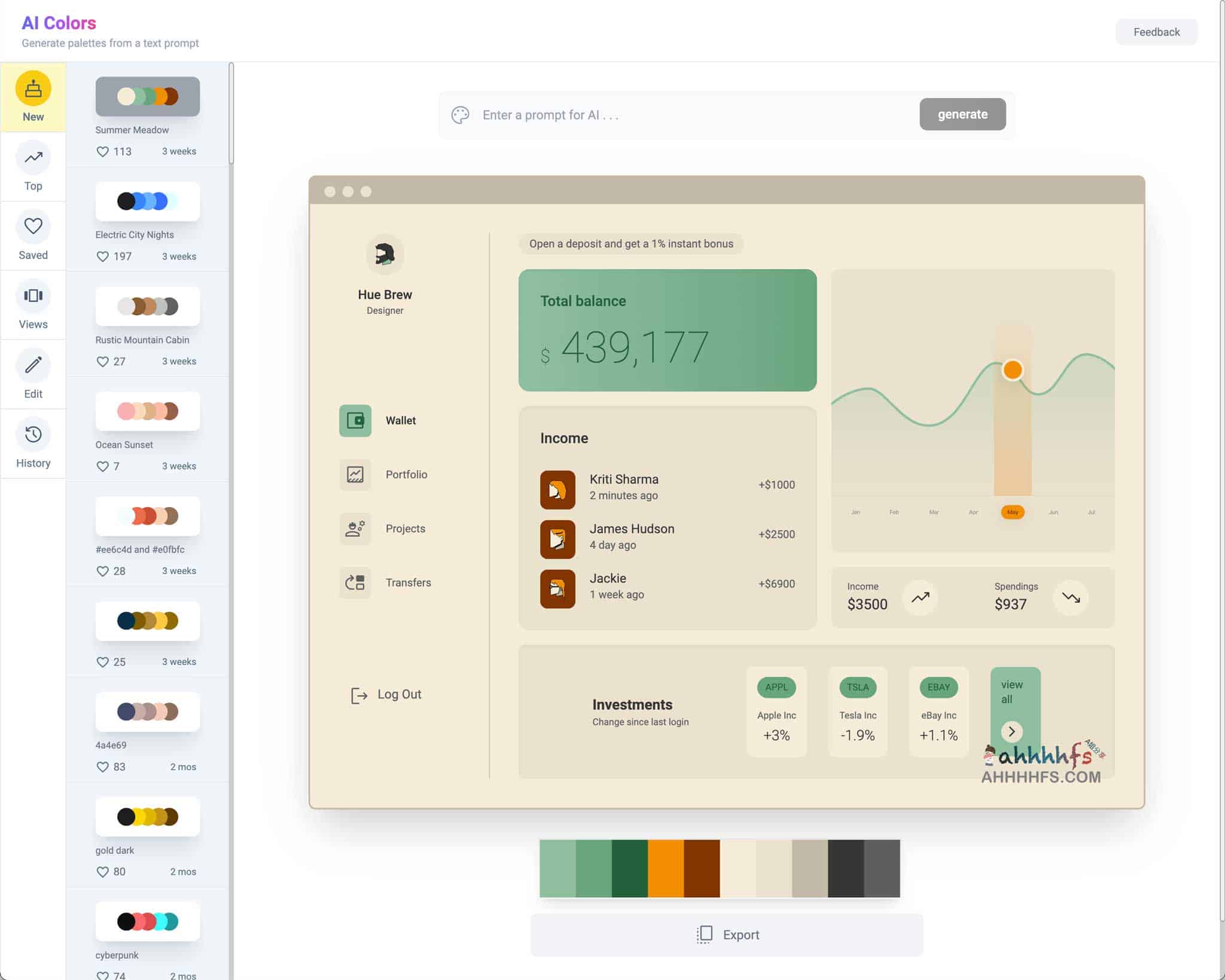 AI Colors一款免费的在线AI 调色板生成器,提供了浏览、编辑、可视化和生成独特调色板的功能,旨在帮助用户创建炫酷且独特的调色板,AI 调色板生成器利用人工智能技术,根据用户输入的关键词(如科技感、贴心的、淡黄晚霞等等)即可自动生成相匹配的配色方案,每种配色方案都有对应的效果展示,而且支持中文关键词,非常不错,简直是一款设计师配色神器。