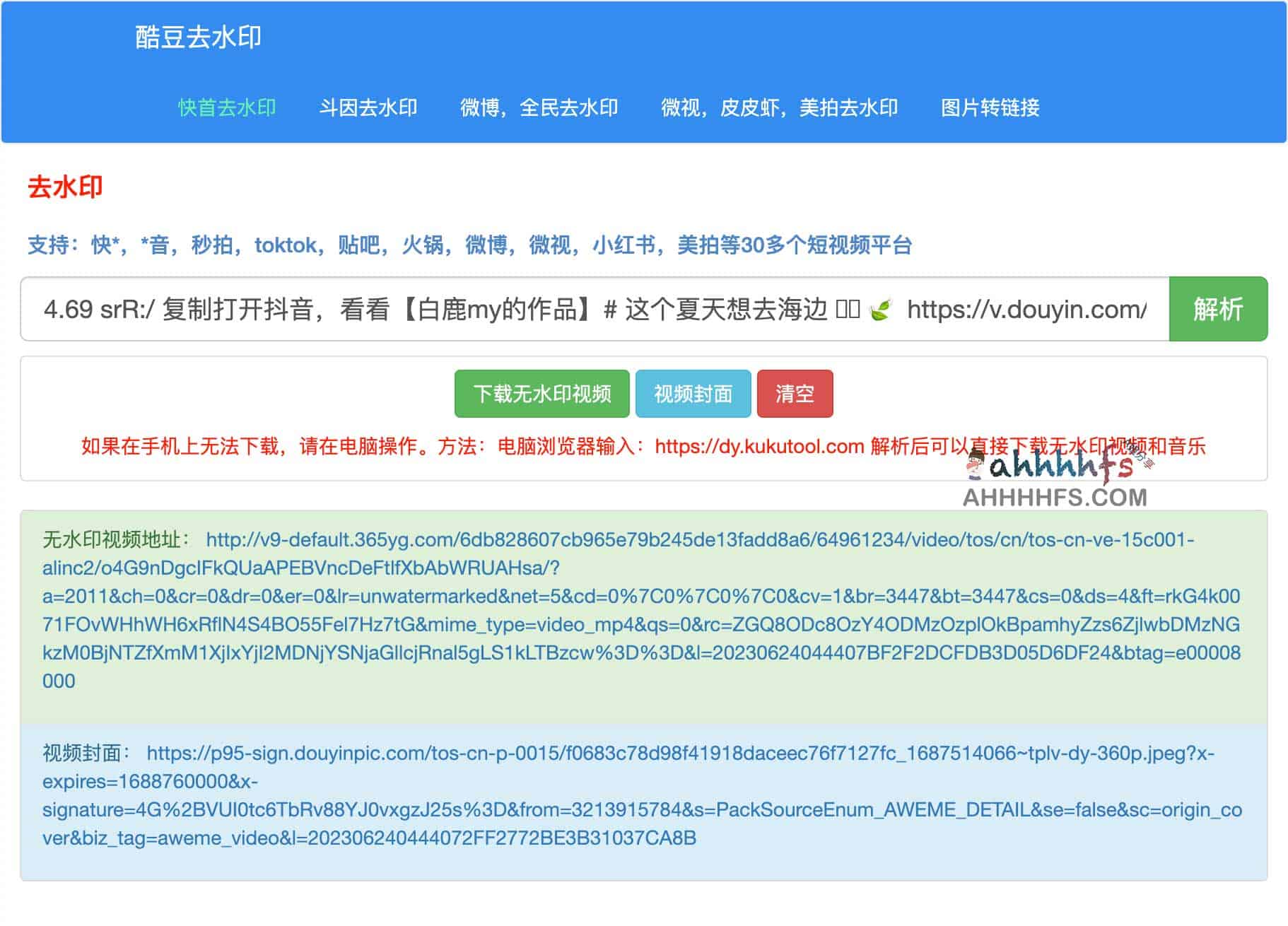 酷豆去水印是一款免费在线短视频去水印工具,支持快手、抖音、秒拍、tiktok、贴吧、微博、微视、小红书、美拍等30多个短视频平台视频解析下载,试了一下去水印的抖音的可以去,微博的不太行,其他平台的自行测试,解析下载还是可以的,而且免注册登录直接使用。