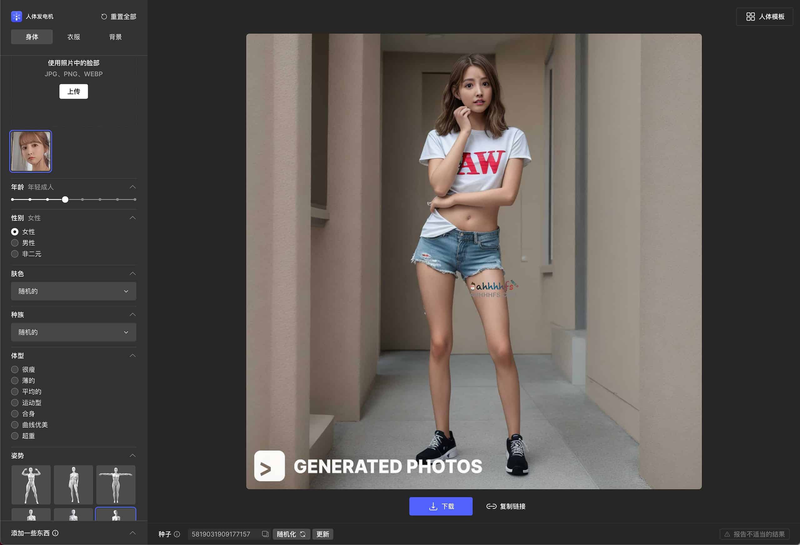 Human Generator是一个在线AI人类生成器,使用人工智能在线生成不存在的人物,可以实时生成真实全身照,支持更换服装并修改面部和身体姿势、年龄、肤色、种族、发型、发色、服装等等参数,还可以上传自定义的脸型数据,生成的人物照片可以免费下载。