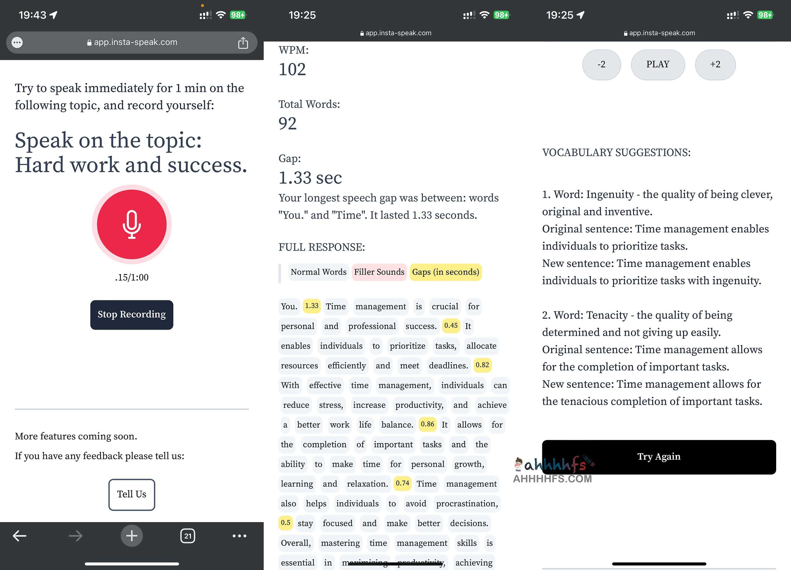 instaSpeak AI是一个在线免费AI英语雅思口语分析机器人,是一个基于人工智能的音频分析工具,为用户提供全面、准确的音频数据报告,帮助用户提高英语口语水平。而且使用简单,直接根据屏幕给出的提示主题,使用英文讲述一分钟,期间会进行录音,点击结束后,AI口语机器人将对录音进行分析,提供WPM、词汇量、停顿时间等等结果分析,并且还会给出建议,而且还是免费的,非常不错。