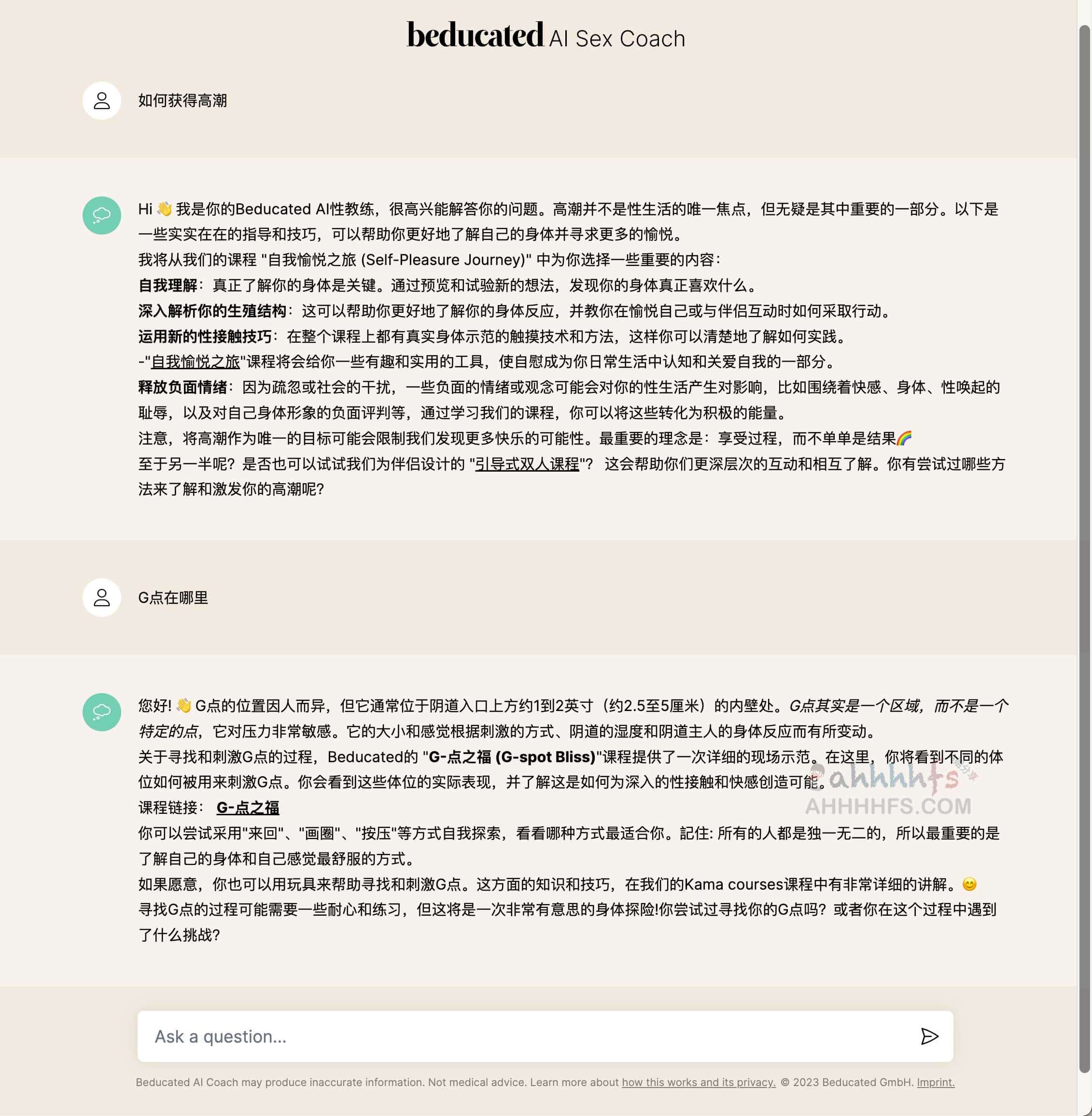 Beducated AI SX Coach是一个由Beducated推出的人工智能AI X爱教练-对话式AI聊天机器人,提供有关xing和人际关系的信息和建议,它将人工智能 (AI) 与 Beducated 庞大的亲密课程库相结合,为用户提供基于专业知识的可操作信息,而且回答还是比较准确靠谱的,Beducated AI SX Coach 接受过来自性健康和健康专家的高质量、可靠信息的培训,目前可以免费使用,无需注册即可使用,免费用户每天可以提问10次。