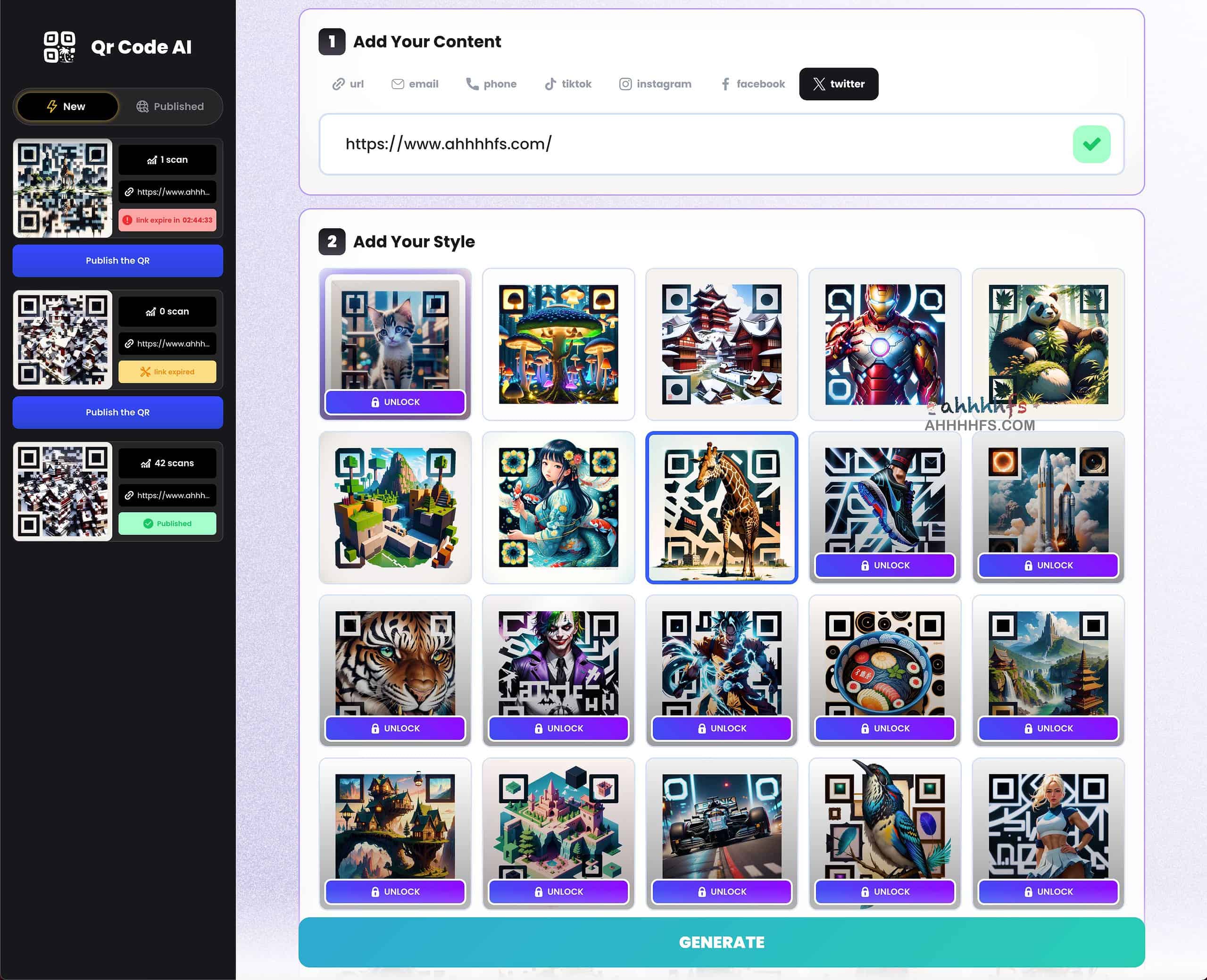 QR Code AI是一个免费AI艺术二维码生成工具,利用人工智能AI生成带图案美化的二维码,目前支持URl、Email、电话号码、TikTok、Instagram、Facebook和Twitter等等二维码生成,直接填写信息点击生成即可,不过使用需要注册登录,免费用户只可以使用预设的几种样式,感兴趣的同时可以试试。