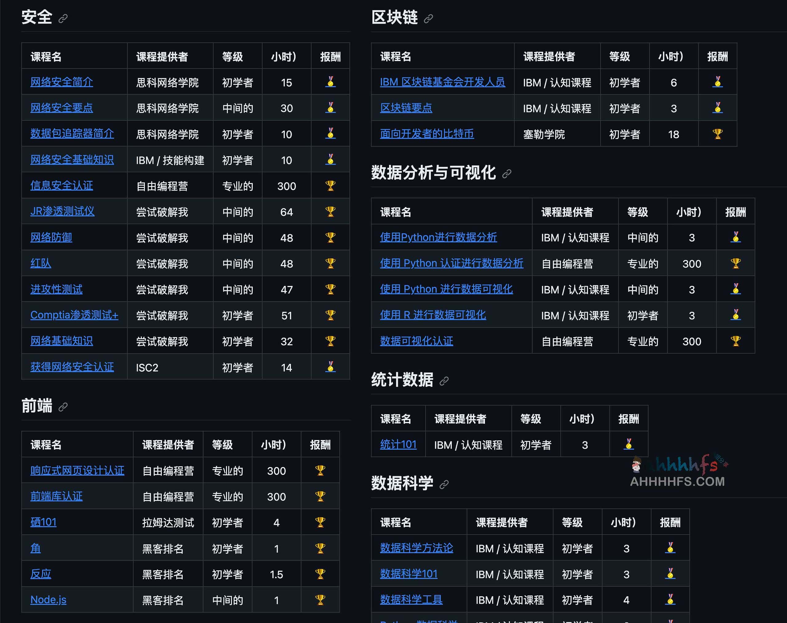 Awesome Certificates是一个精选的 IT、计算机科学和商业课程列表大全收集GitHub仓库,课程范围涉及到安全、前段、后端、区块链、统计数据、大数据、机器学习、编程、商业等等,列表中的每门课程以及徽章和证书均可免费参加,完成后可获得证书和数字徽章。