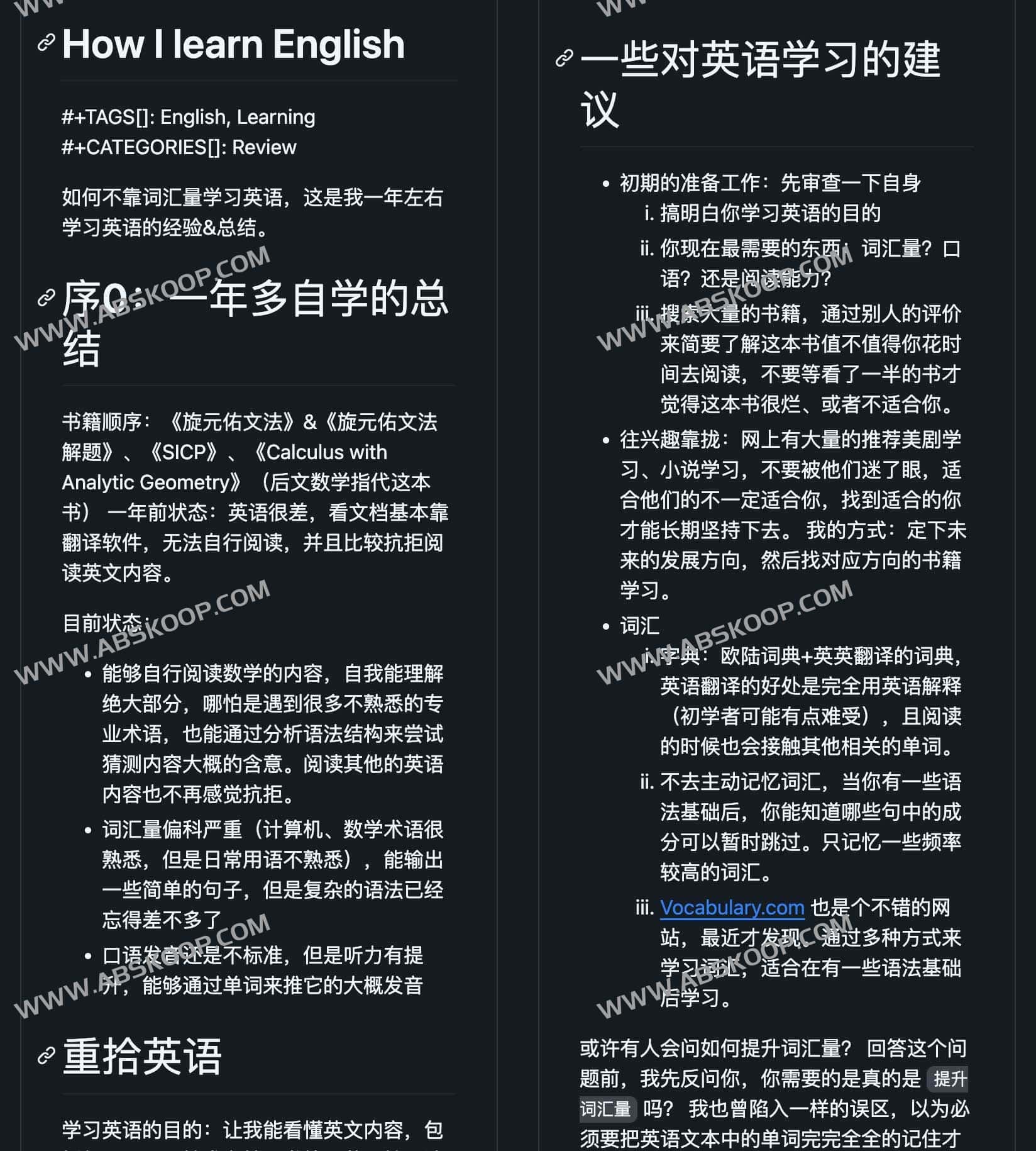 How I learn English-我如何学习英语,如何不靠词汇量学习英语,这是网友一年左右学习英语的经验&总结分享,包括英语学习的建议和书籍推荐、语法作用等等相关英语学习资源,这份在线文档是网友个人的学习路径、建议,请谨慎思考后选择性的采纳,兴趣才是最好的老师。
