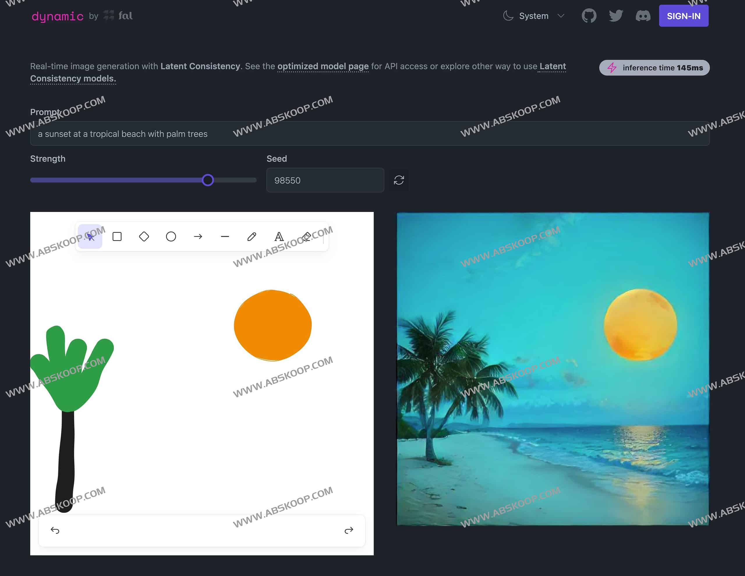 dynamic是一款在线免费的手绘图AI实时图像生成工具,基于Stable Diffusion和fal搭建的在线工具,演示了基于画布中的绘图的实时 AI 图像生成,直接手动绘画加上提示词,AI即可实时生成图像预览,非常惊艳。