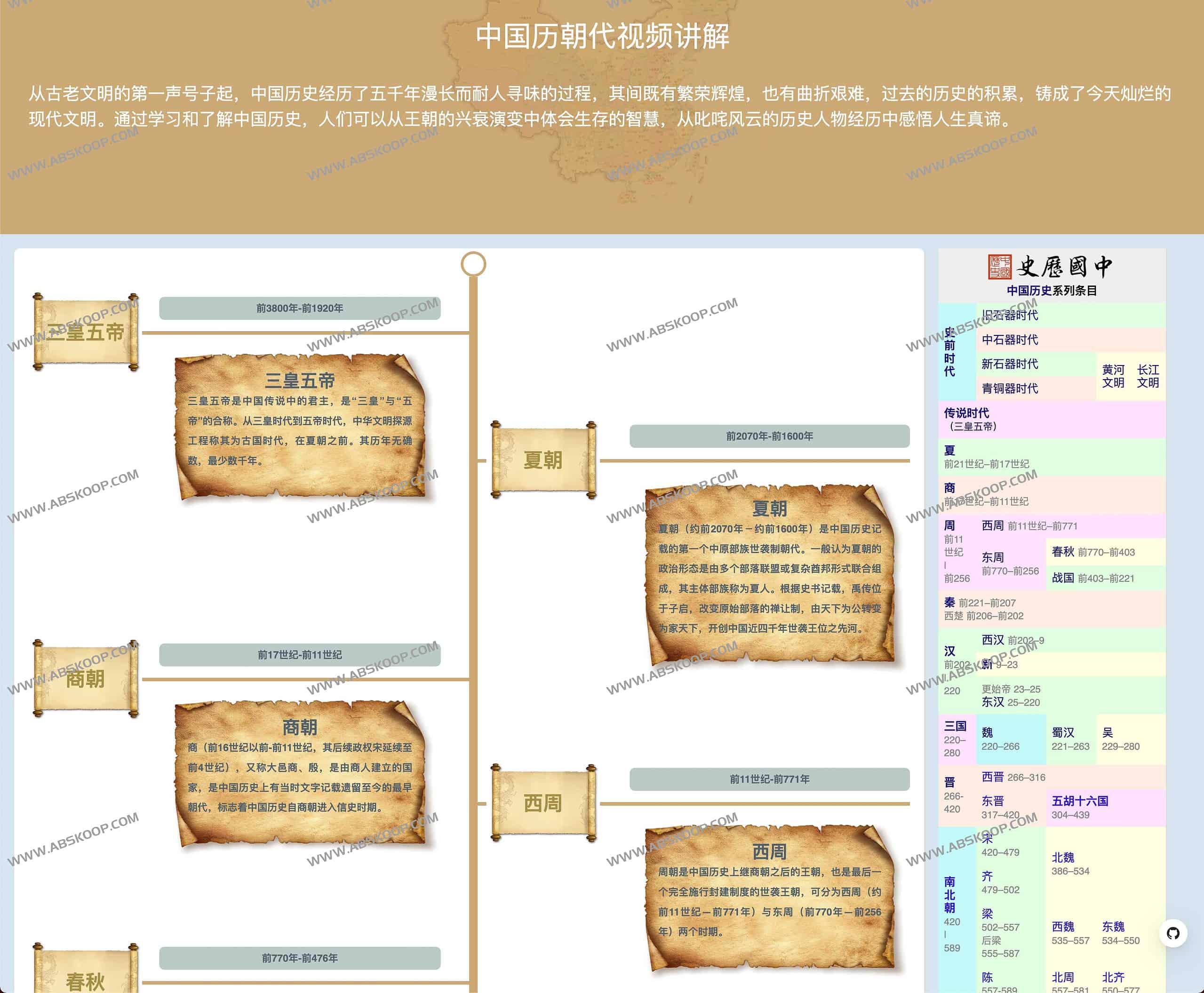 Chines History Video-中国历朝代历史视频讲解,网友制作的一个在线历史知识网站,汇聚了B站上综合数据(点赞,播放,投币,收藏)最高的一个/几个视频,收录整理了前3800年-前1920(三皇五帝)年开始到1912年-1949年(中华民国)期间的视频数据,做了比较精致的排版和介绍,点开就能看到介绍和相关的视频,纯手动整理,用爱发电,非常适合历史爱好者收藏学习。