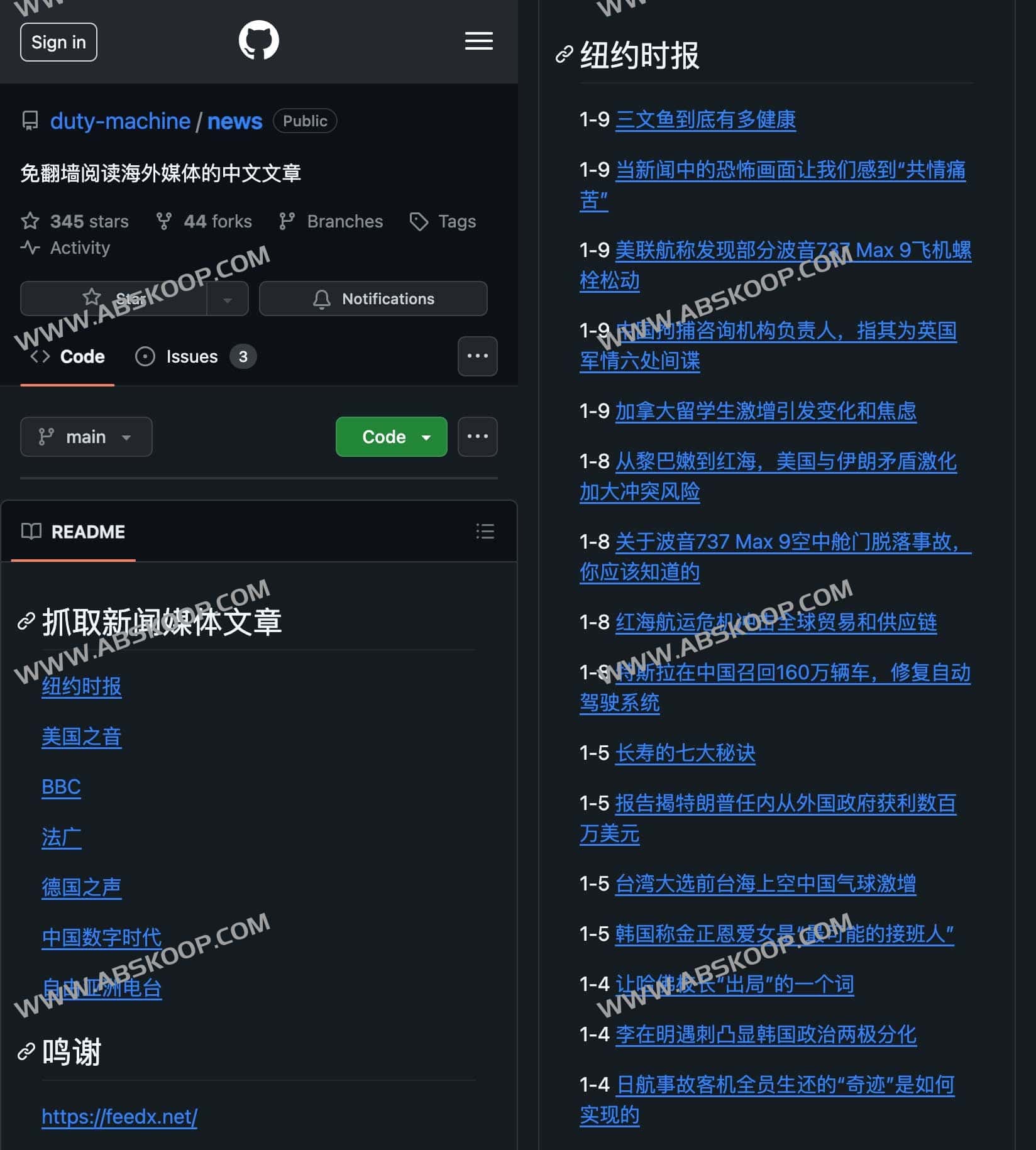 News,网友制作的一个项目,自动抓取海外多个著名新闻媒体文章,实现可以免翻阅读海外媒体的中文文章,包括纽约时报、美国之音、BBC、法广、德国之声、中国数字时代、自由亚洲电台等等,前提是你网络可以访问GitHub即可。