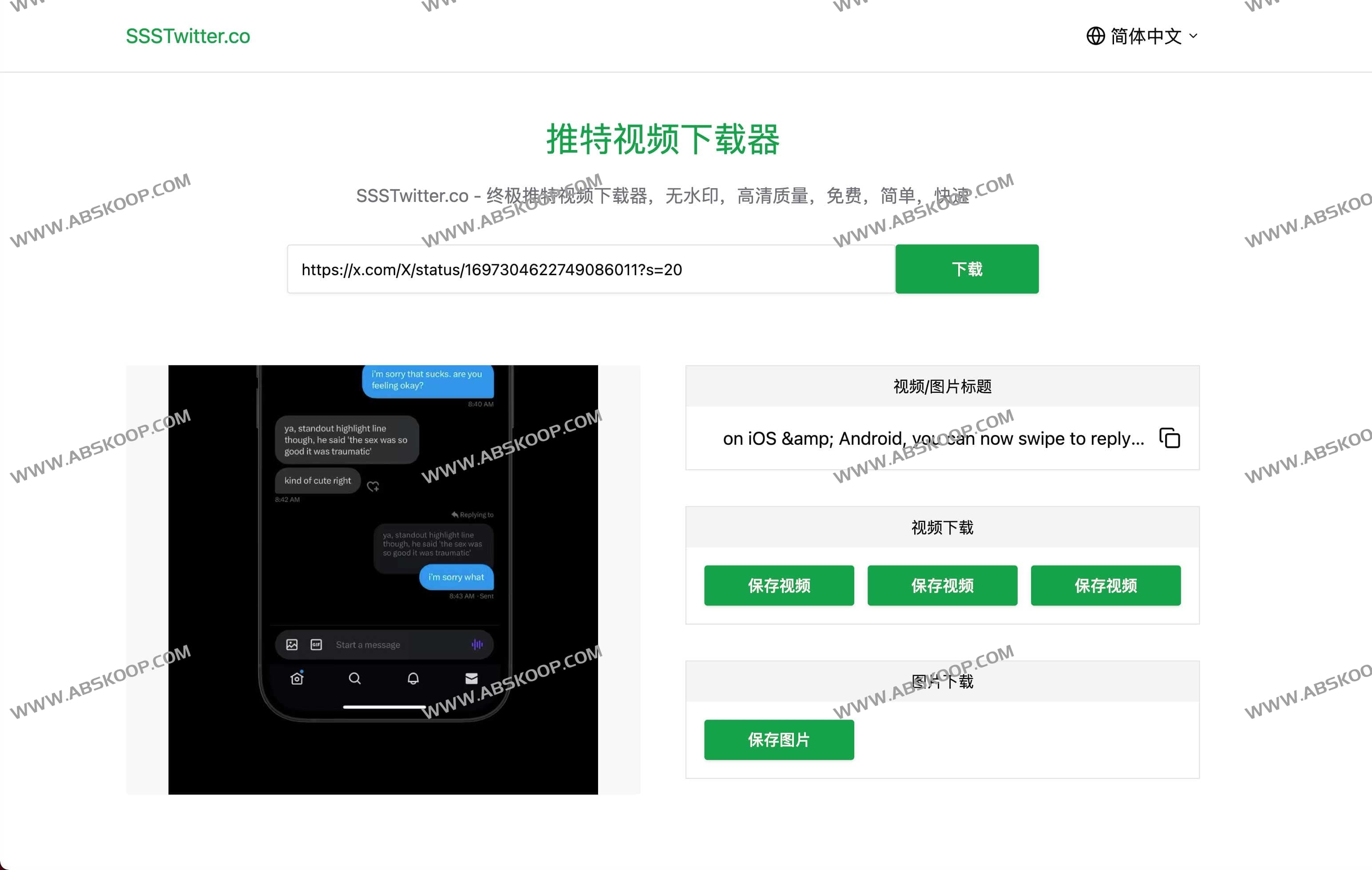 SSSTwitter是一款免费在线推特视频下载器,高效地下载任何推特视频,高清质量,免费,简单,快速,并且支持facebook、YouTube、TikTok、instagram等等平台的视频下载,实用也非常简单,无需任何应用,无需安装软件,只要复制视频 URL 链接并将其粘贴至 SSSTwitter 线上下载器即可。无论是任何浏览器、任何操作系统,都能从 SSSTwitter 下载并保存社交视频。SSSTwitter可在手机、个人电脑或平板电脑,以及含有 Android、iOS、Windows 等任何操作系统上运行。