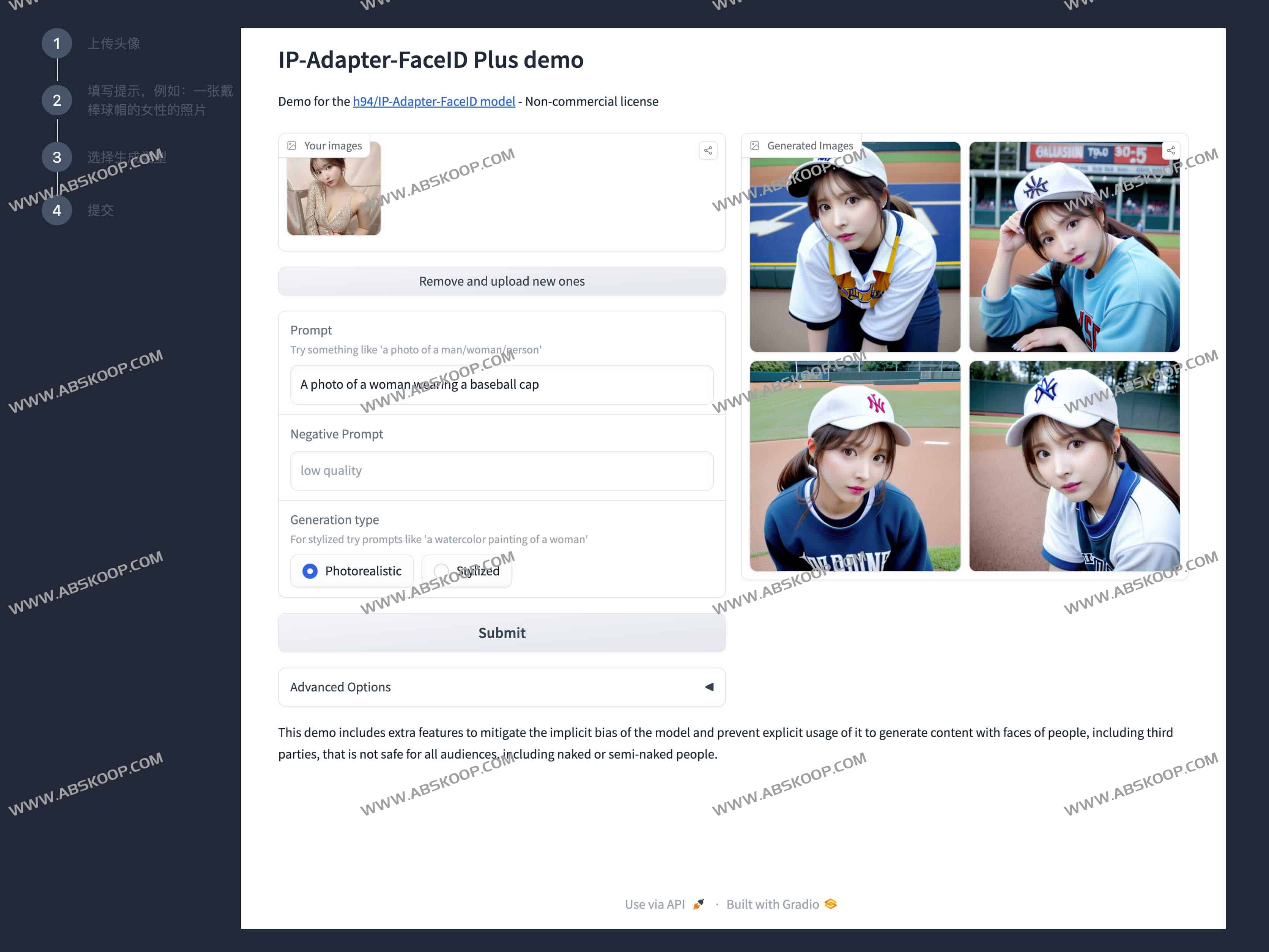 IP Adapter FaceID是一个免费AI克隆人脸工具,可以克隆和生成任意人脸,仅通过文本提示,就能生成基于一张脸的各种风格的图像,而且这个AI人脸克隆工具使用也非常简单,只需上传几张照片,并输入如“一张戴棒球帽、正在进行运动的女性的照片”之类的提示词,就可以生成自己在各种场景中的图像,克隆你的面部,非常小白的操作。