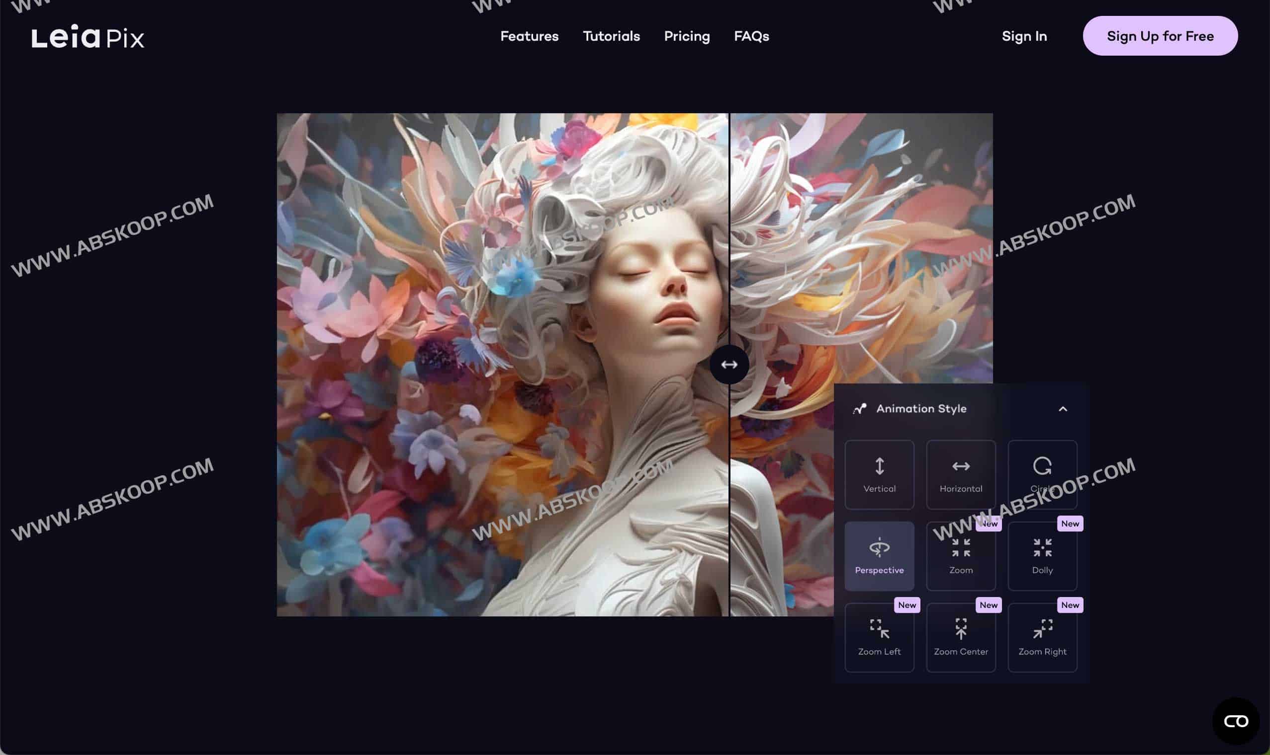 LeiaPix是一个基于网络的创新人工智能平台,能够将2D照片转3D效果的实用AI工具,使用 LeiaPix AI 将 2D 图像转变为迷人的 3D 动画,让你的照片图像栩栩如生。目前LeiaPix 可处理多种图像格式,包括 PNG、JPG/JPEG、HEIC、WEBP,支持导出mp4、GIF、PNG等等格式,使用也非常简单,提供试用额度。