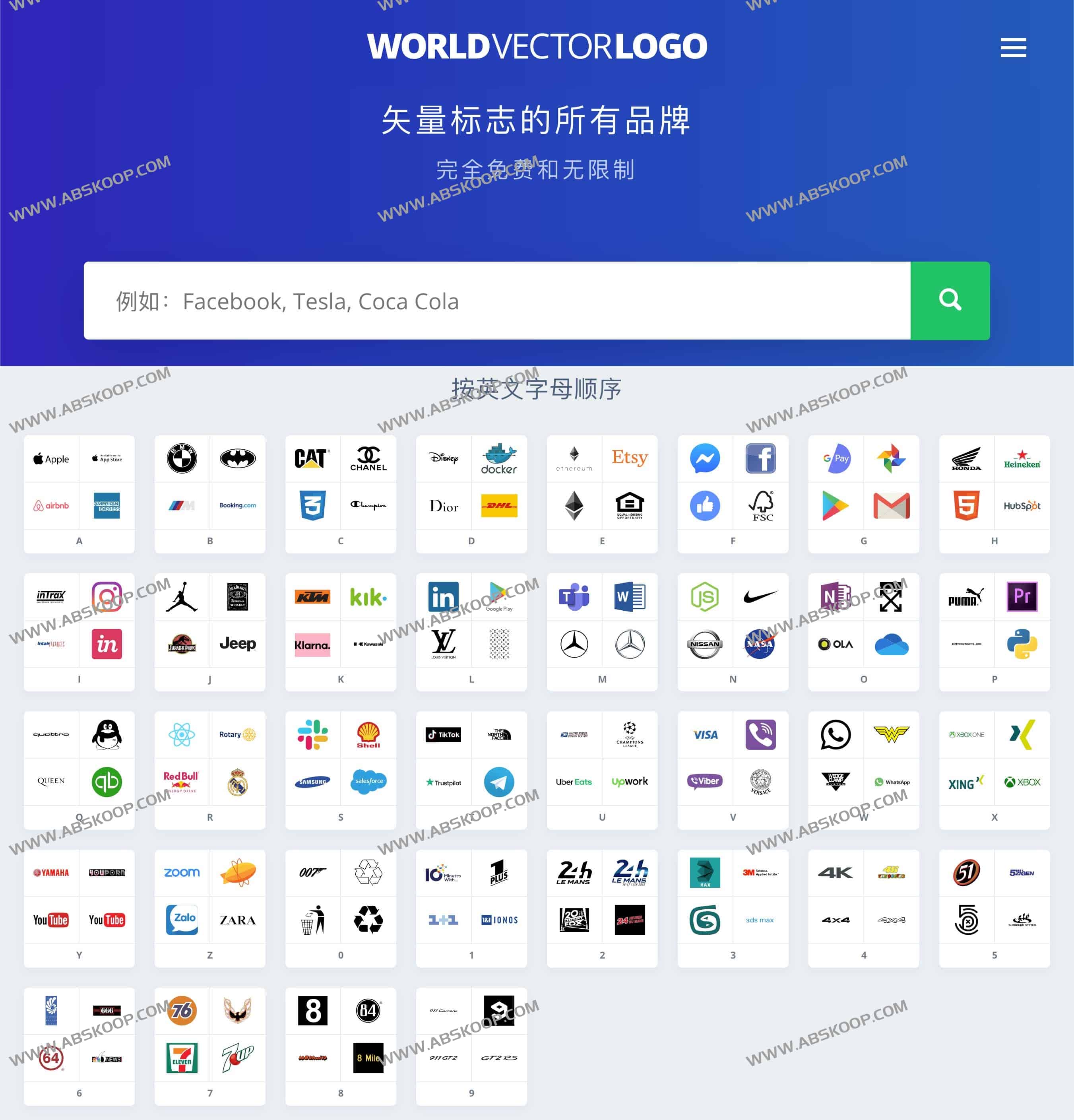 Worldvectorlogo是一个在线免费全球矢量logo素材下载网站,提供全世界标志LOGO的矢量图文件,用户可以通过关键词搜索、按英文字母顺序或随机展示的方式找到各种品牌LOGO图案,用户可以从网站免费下载并获取标志LOGO的向量图文件,格式为SVG,而且完全免费和无限制。