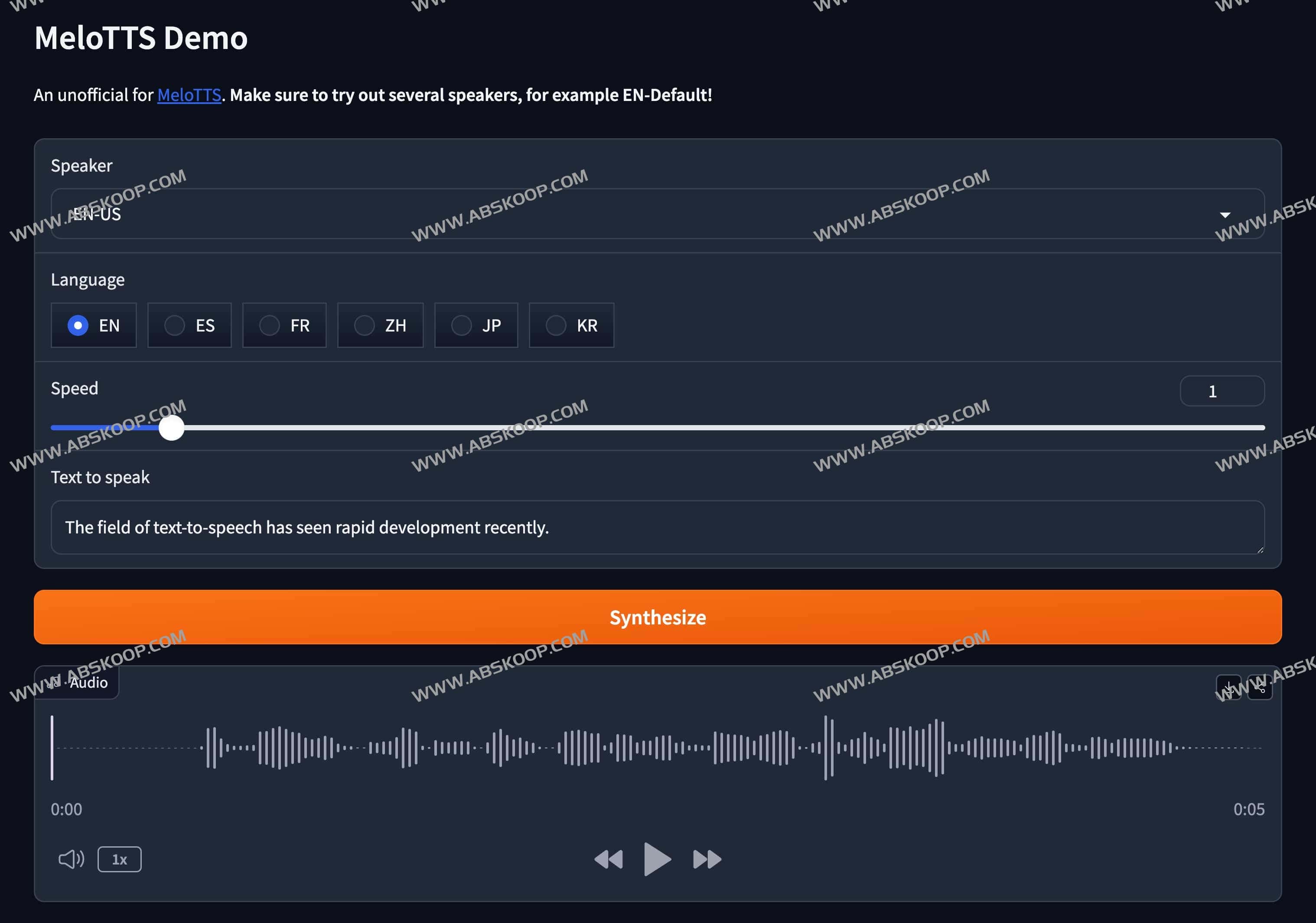 演示地址:https://huggingface.co/spaces/mrfakename/MeloTTS