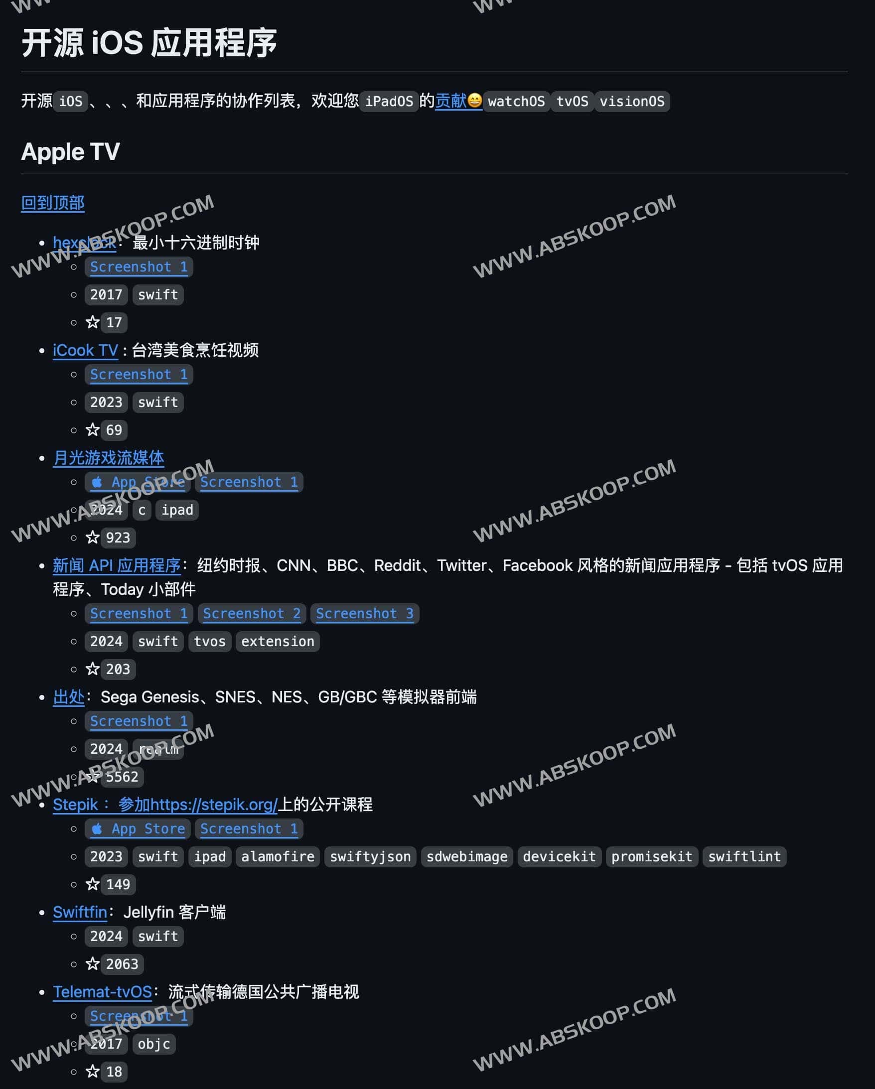 Open-Source iOS Apps是一个收集开源 iOS 应用程序的GitHub项目,收集更新iOS,、iPadOS,、watchOS,、tvOS、visionOS等等的开源app信息,包括开源app的信息、介绍,开源地址、评分等等,想要学习开发iOS应用的同学可以寻找相关的开源app学习。