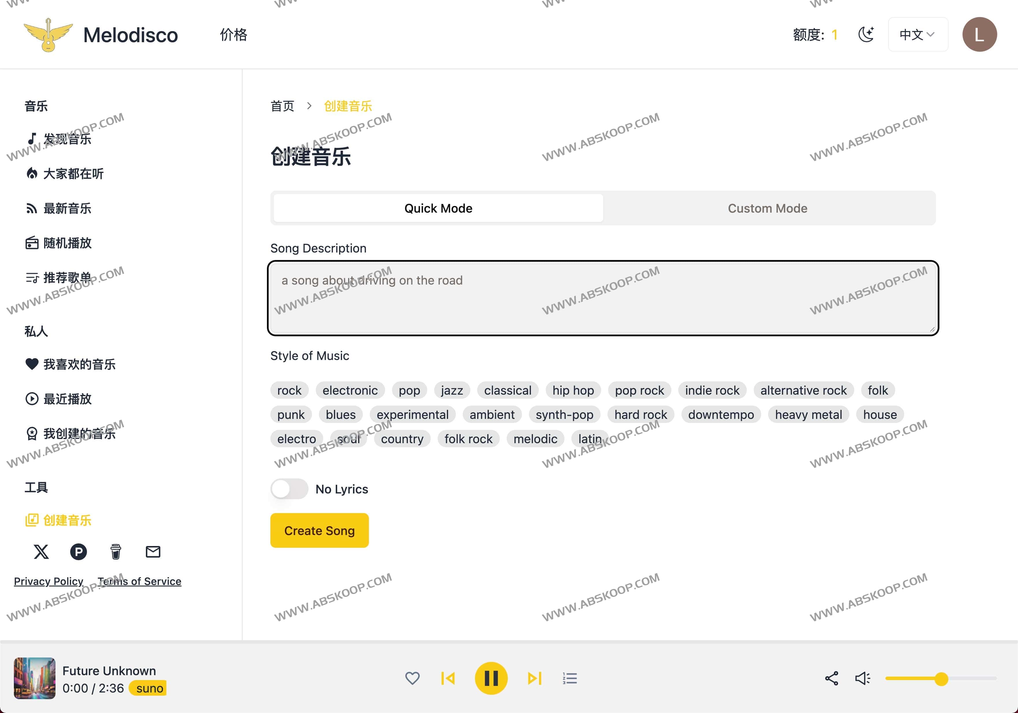 Melodisco是一个在线AI音乐播放器和AI音乐生成器,可以在AI音乐播放器中发现流行的、最新的和随机的AI歌曲,目前收录了 5000+ 首 AI 歌曲,作者还写了一个播放器组件,支持顺序 / 随机 / 单曲循环播放音乐,支持多语言,支持 light / dark 两个主题样式,还支持AI音乐生成器,感兴趣的同学可以到网站体验。