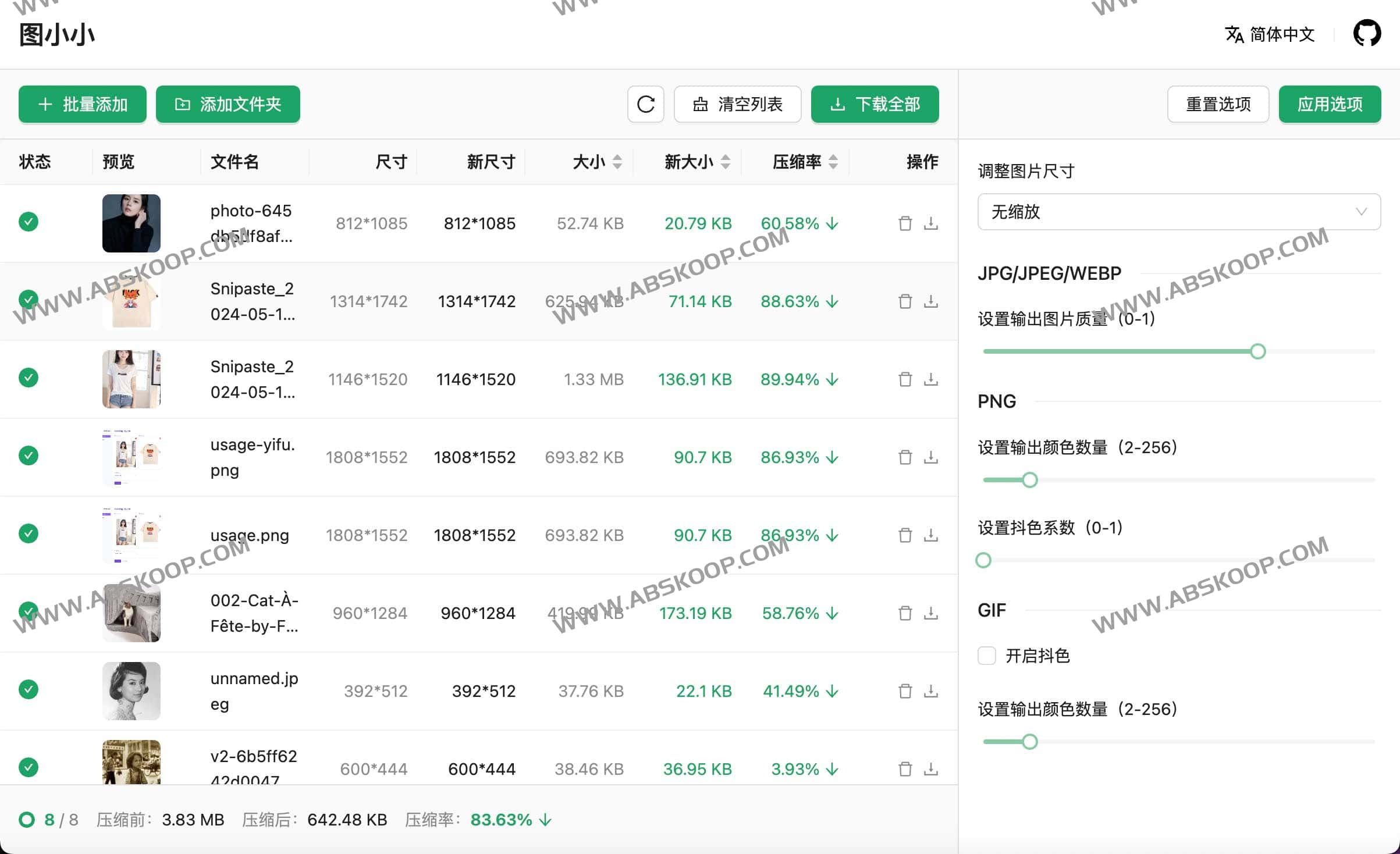 Pic Smaller是一个开源在线超好用的图片压缩工具,支持WebP、PNG、JPEG 和 Gif 图像在线压缩,用户界面简单直观,图片压缩在本地进行,没有数据经过任何服务器,所以比较安全,项目基于vite + React开发。