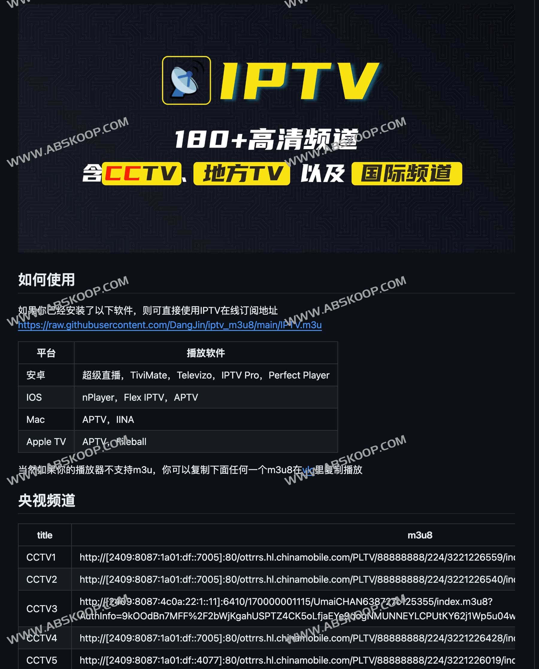 awesome iptv是一个开源的github仓库,收录了超过180个高清频道,含CCTV系和地方卫视,还有国际频道,仓库iptv.m3u来自于YueChan 大神, 基于原创内容进行了优化,整理了在不同平台如何安装使用,并且将央视频道、地方卫视、国际频道的m3u8地址单独提取展示,便于大家快速使用。