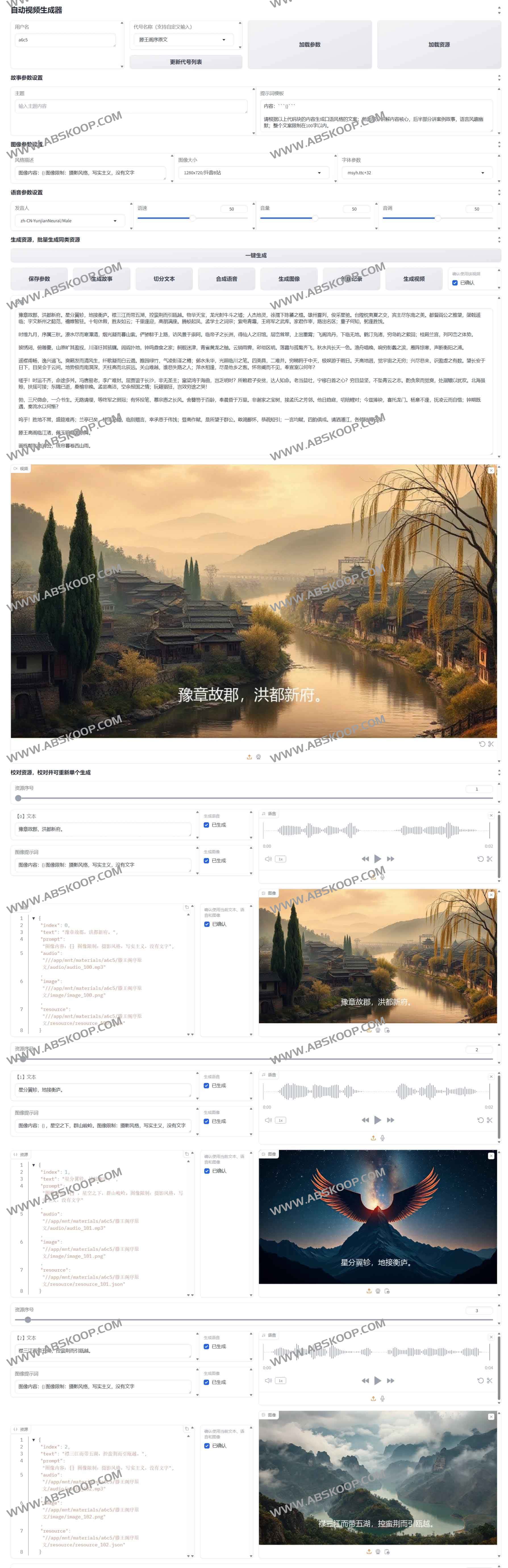 auto-video-generateor是一款AI自动视频生成器,给定主题,自动生成解说视频,用户输入主题文字,系统调用大语言模型生成故事或解说的文字,然后进一步调用语音合成接口生成解说的语音,调用文生图接口生成契合文字内容的配图,最后融合语音和配图生成解说视频。