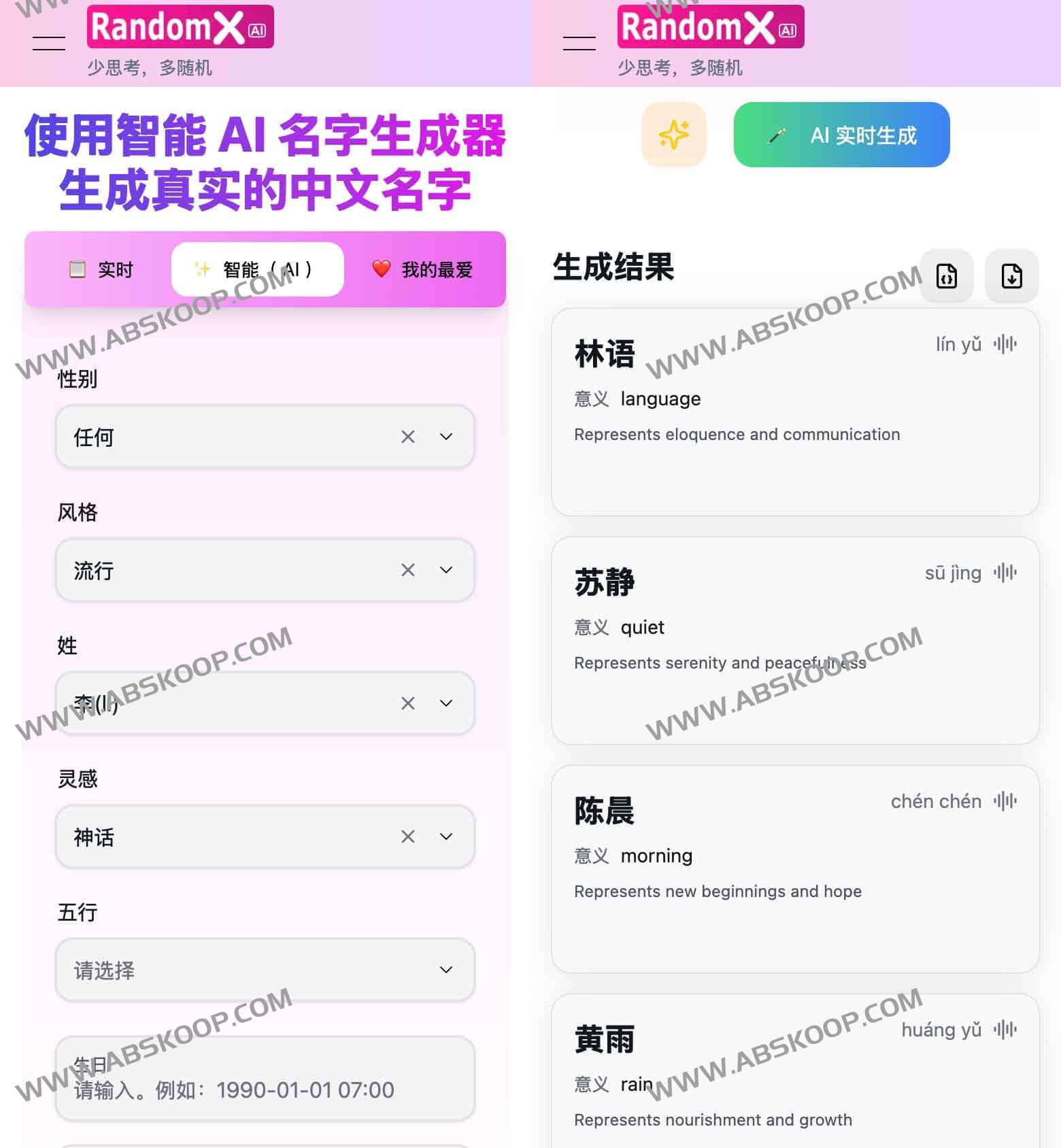 RandomX是一款在线AI中文名字生成器,使用智能 AI 名字生成器生成真实的中文名字,为人物、企业或个人使用寻找独特且适合文化的中文名称,而且能够根据性别、风格、灵感、姓氏、五行等等定制要求进行名字生成。随机中文取名生成的每个名字都附有其含义、解读和拼音。未来更新将包括拼音发音、中国传统五行解读、名字评分以及历史上有名的同名人物。工具完全免费使用,不收取任何费用,也无需订阅,将来也是免费使用。