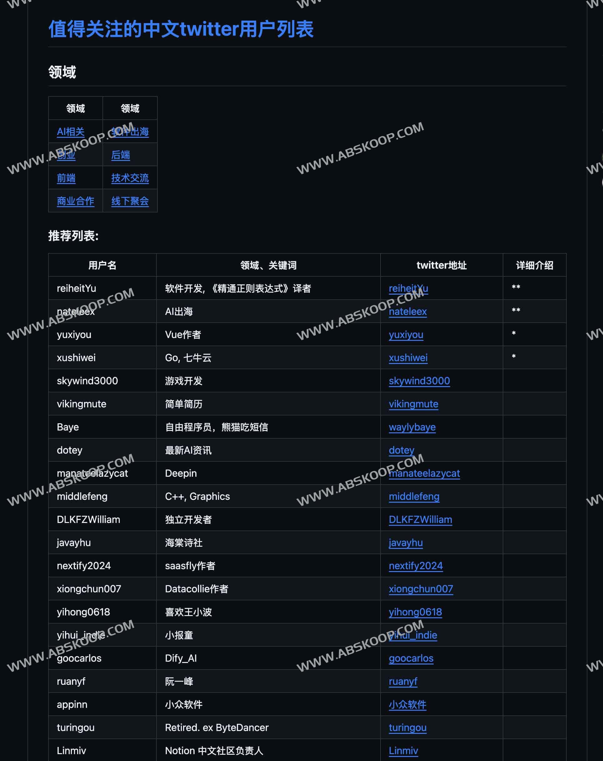 awesome_twitter_CN是一个值得关注的中文twitter用户列表,起因是因为作者刚开始使用twitter的时候,不知道关注谁。有一些很好的推特用户,也没有人关注。所以制作了这个列表,目前包括AI相关、软件出海、创业、后端、前端、技术交流、商业合作和线下聚会等等领域, 欢迎大家踊跃推荐自己觉得的不错的中文twitter用户,(色q、政治)内容除外,排名不分先后。