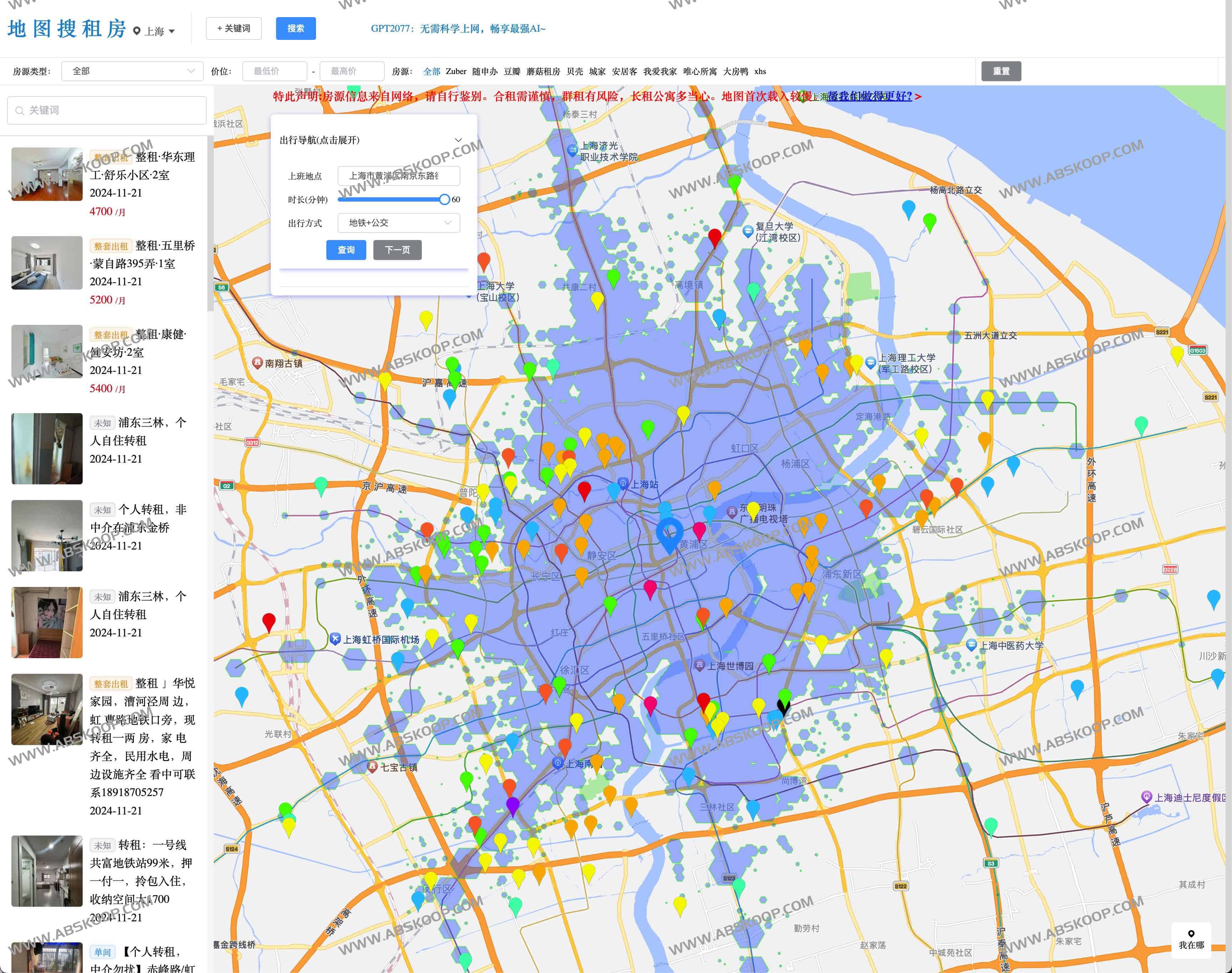 地图搜租房,一个免费根据地图找房的在线工具,通过实时爬虫获取公开租房信息,直接在高德地图上直观展示房源位置+基础信息,同时提供住址到公司的路线计算(公交+地图 or 步行导航),已实现豆瓣租房小组、Zuber合租、蘑菇租房、58品牌公寓/安选、Hi住租房、房多多、贝壳租房、v2ex租房帖子、自如/青客/城家等房源信息数据爬取,部分房源价格支持筛选功能,多平台房源爬虫 + 高德地图强力驱动,帮助你迅速找到合适房源。