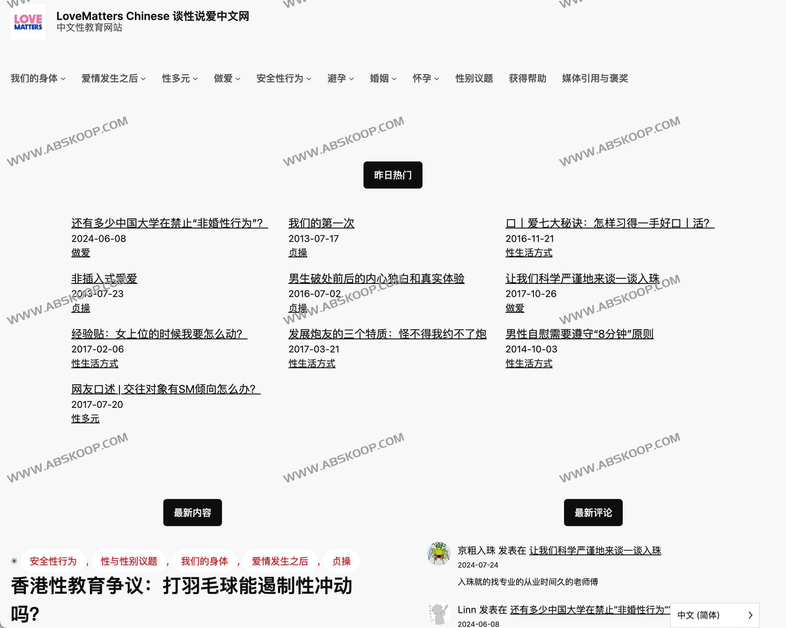 LoveMatters Chinese 谈xing说爱中文网是一个正规的xing教育科普网站,致力于传播科学的xing知识和健康的xing教育。网站由xing学专家、医生等组成的专业团队提供支持,内容科学严谨。采用新闻视角和多媒体手段,以趣味易懂的方式传播xing知识。与多家权威学术机构和国际组织合作。通过网站、微信、微博等全媒体传播xing教育。