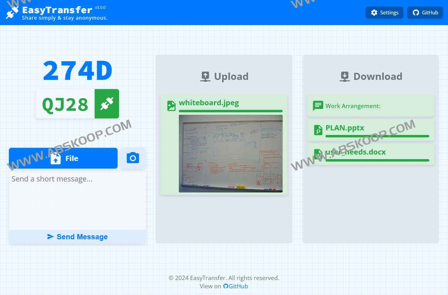 EasyTransfer是一款免费、匿名、加密且易于使用的端到端加密(E2EE)文件传输工具。它基于webRTC和Vue.js构建,无需安装任何软件、注册账户、扫描二维码或分享URL链接,也无需将文件上传到服务器,因此用户无需担心网络环境问题。使用时,用户只需在需要传输文件的两台设备上访问EasyTransfer的网页,将其中一台设备的四位设备代码输入到另一台设备的输入框中并点击连接即可。连接成功后,用户可以通过拖放或选择文件的方式进行文件传输,支持一次发送多个文件,也支持大文件传输、优化传输速度、拍照传输、纯文本传输以及并行传输。同时,用户还可以在设置中自定义STUN和TURN服务器,或指定最大连接数。