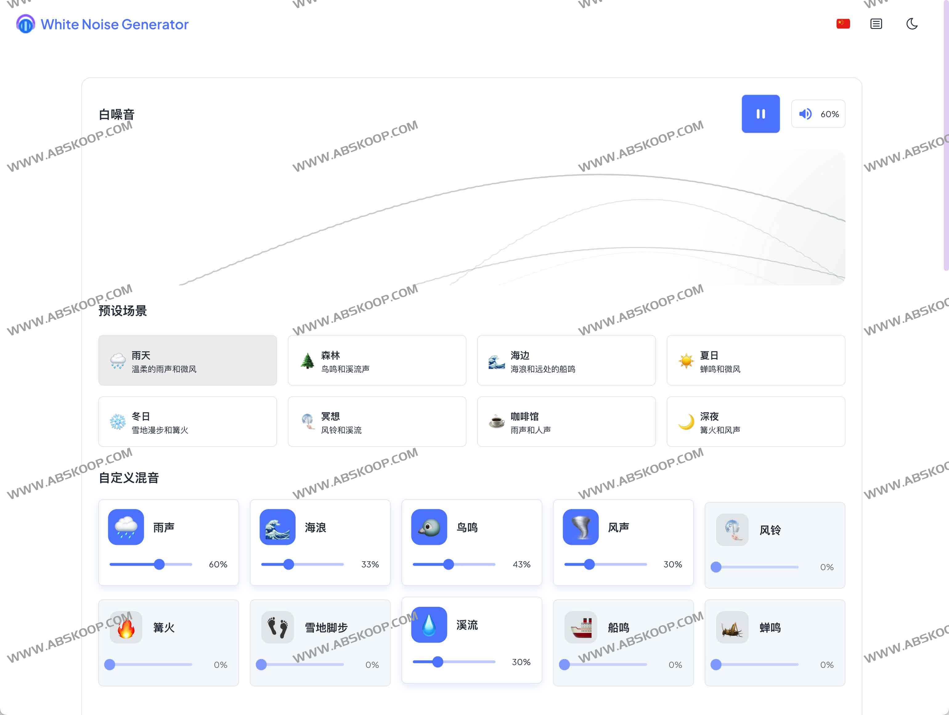 White Noise Generator是一个免费、简单易用的在线白噪音生成器,旨在通过提供多种白噪音类型和预设场景(如工作、学习或睡眠模式),帮助用户提高专注力、放松心情、更快入睡、减少疲劳、提高工作效率、减轻压力和焦虑等。用户只需访问网站,点击“播放”按钮即可开始生成白噪音,通过音量滑块调整音量大小,并根据需求选择不同的噪音场景。网站界面设计简洁友好,包含白噪音波形图、音量调节条和场景选择按钮,方便用户自定义设置和控制白噪音的播放。该网站基于现代Web技术开发,支持桌面和移动设备,使用流行的前端框架和音效处理技术,确保流畅的使用体验。无论是在工作、学习还是休息时,用户都可以通过该网站轻松创建和调整不同的白噪音场景,提升生活品质。