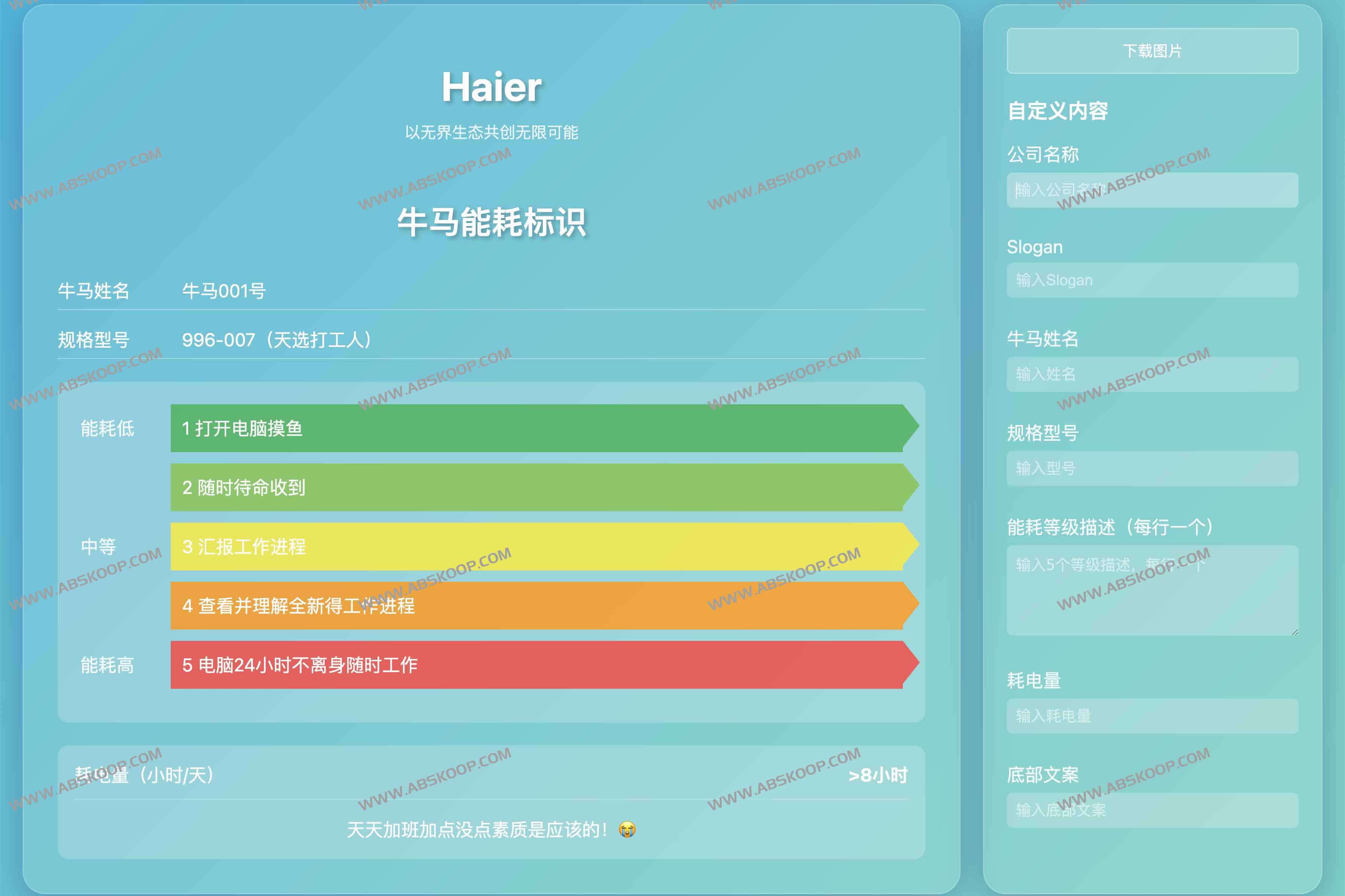 牛马能耗标识是什么 牛马能耗标识是一款职场小工具,支持文案自定义输入,支持图片下载方便分享,为打工人增添快乐的摸鱼小工具,感兴趣的同学可以到网站体验。 牛马能耗标识网站地址 网站:https://niuma.mohuani.top/niu-ma.html github:https://github.com/mohuani/niu-ma 文章导航 Fast Send:点对点文件传输工具夸克网盘自动转存 签到 重命名工具:quark-auto-save