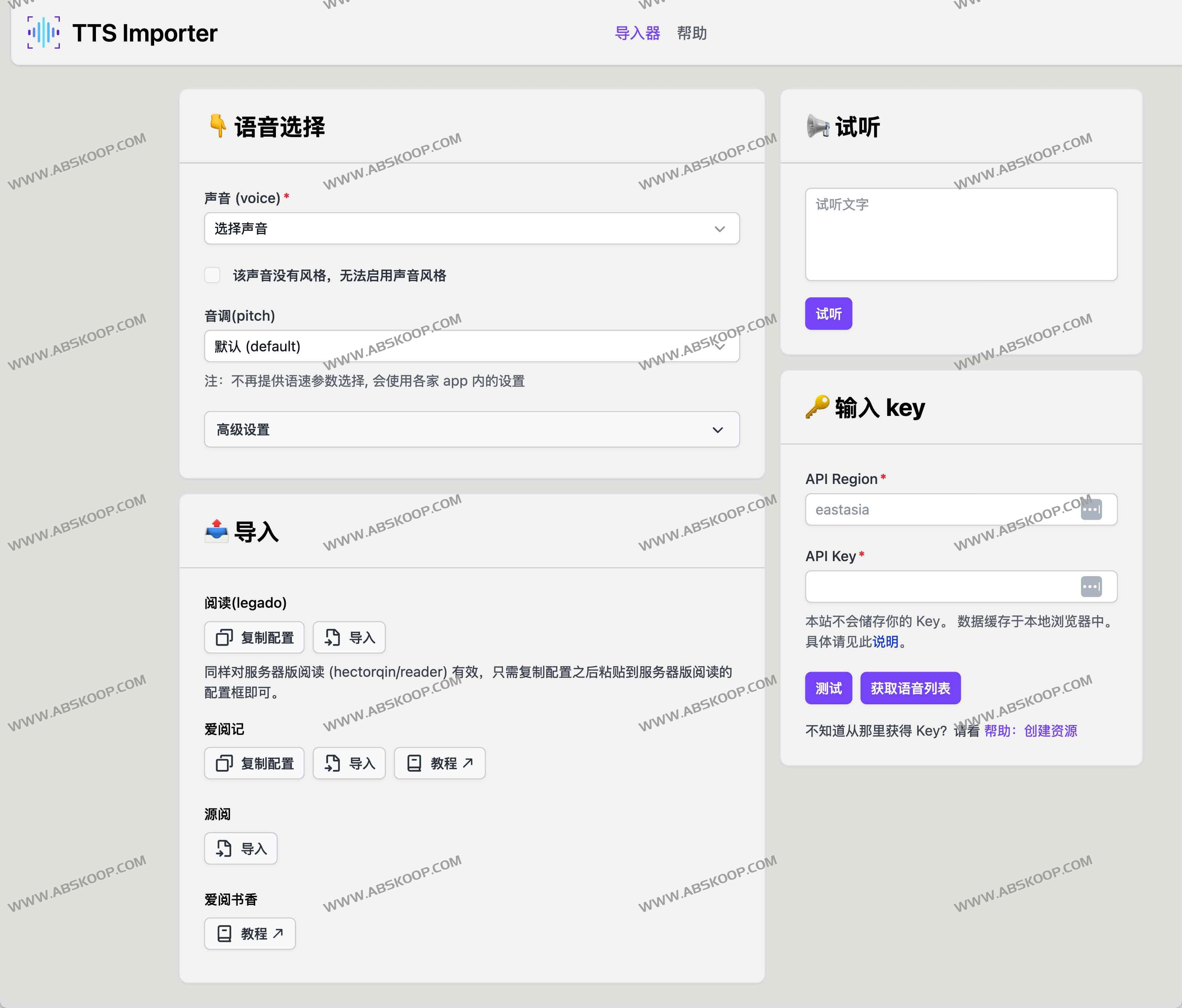 TTS Importer是一款将 Azure TTS 语音合成服务导入阅读软件,帮助用户轻松将微软 Azure TTS 导入到小说软件,支持 阅读(legado)、爱阅记、服务器端阅读(hectorqin/reader)、爱阅书香、源阅读、源阅。而且还有注册好 Azure 账号等等的教程。
