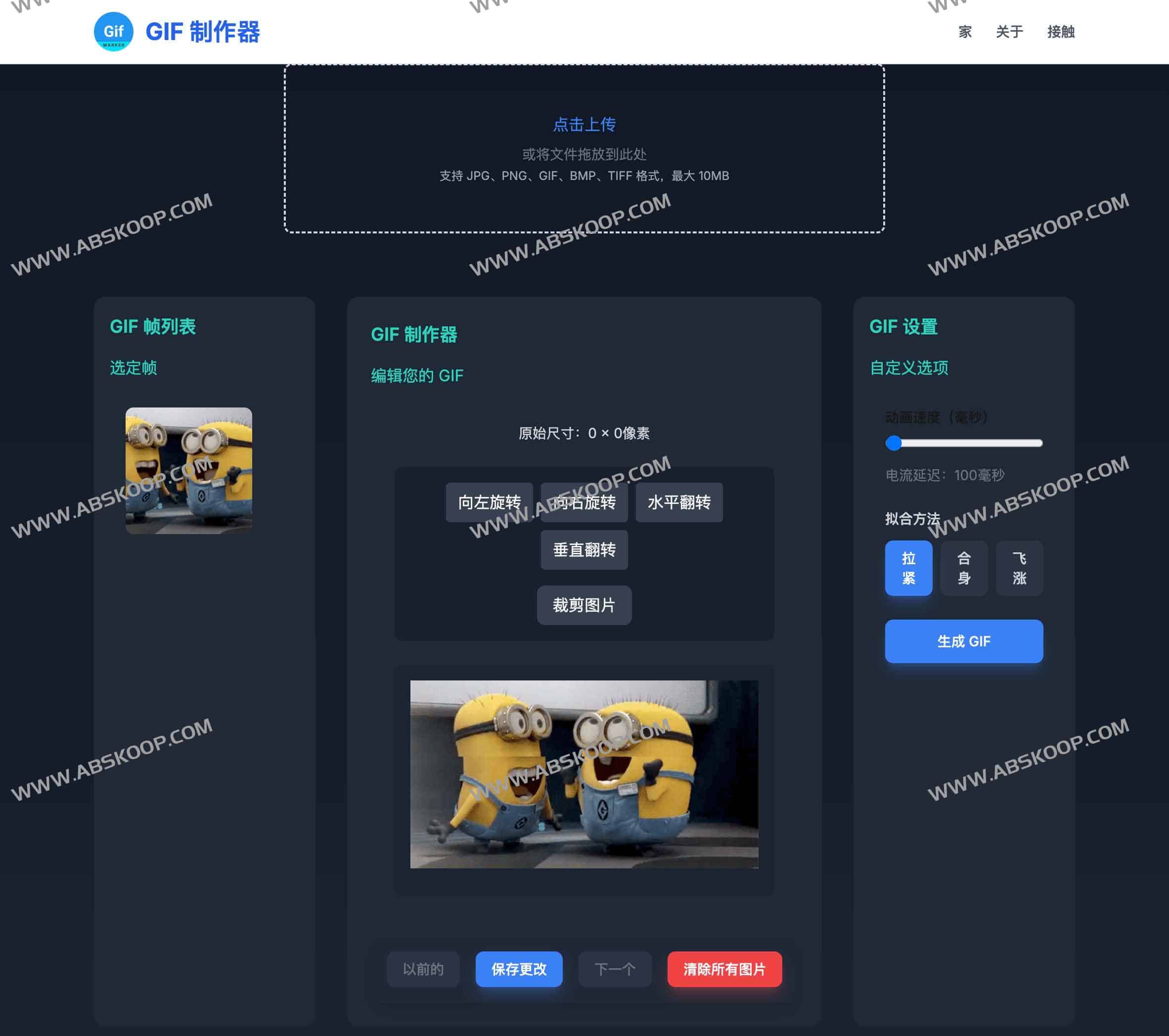 GIF Maker Free 是一款免费在线 GIF 创建和编辑工具,支持 JPG、PNG、GIF、BMP、TIFF 格式,最大 10MB,支持从多张图片生成 GIF、编辑现有 GIF、裁剪调整尺寸、自定义动画速度,并提供无水印导出。无需注册即可使用,界面直观,适合所有用户。平台承诺高质量输出,并注重用户隐私,上传的图片仅用于 GIF 生成,处理后自动删除,不做存储。致力于让 GIF 制作变得简单高效,为用户提供专业级的免费服务。