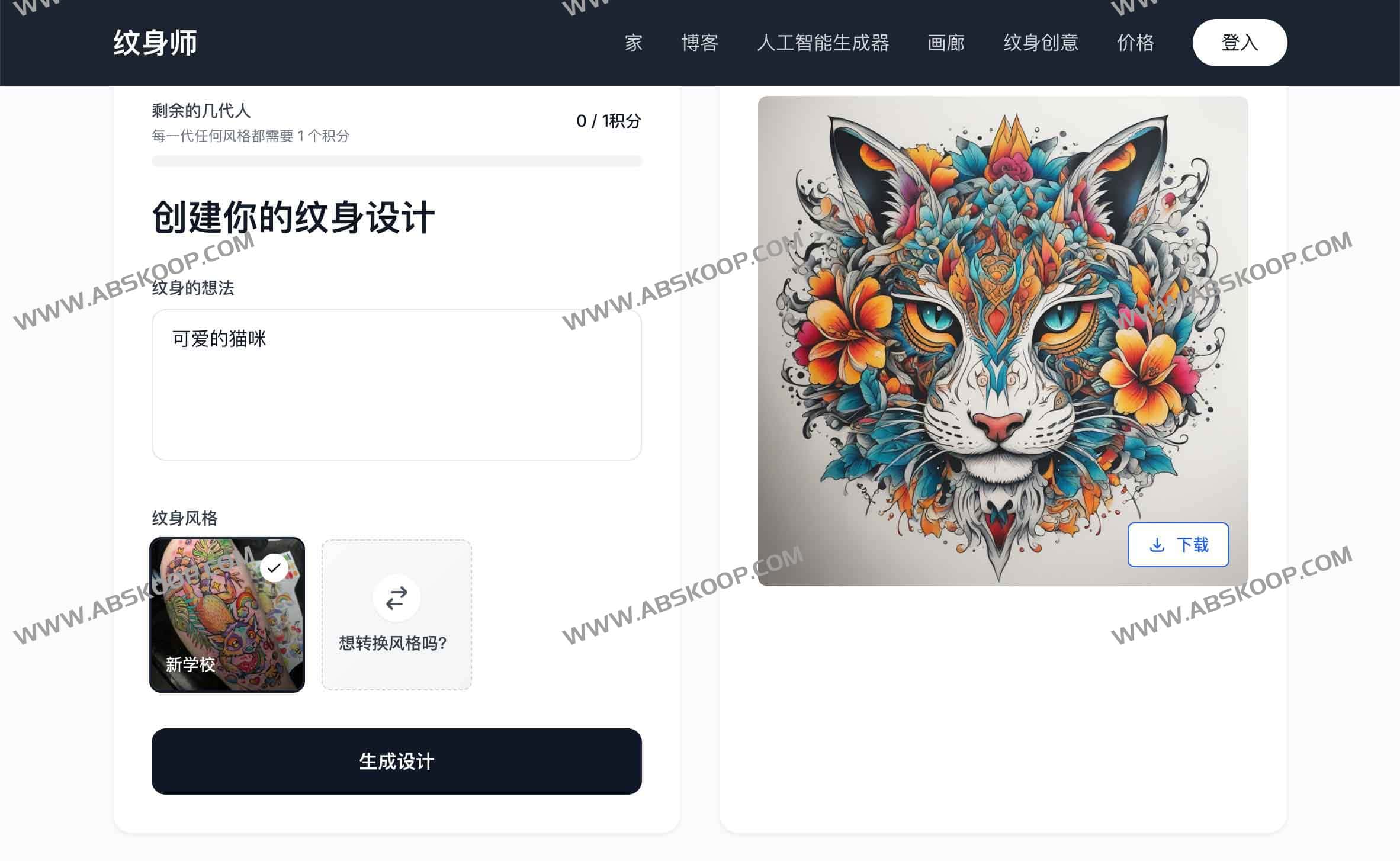 Tattooer是一款AI纹身生成器,可在几秒钟内将用户的创意转化为高质量、专业级的纹身设计,无需任何艺术技能。用户只需用自然语言描述愿景,选择风格,AI即可自动生成多种设计,并支持实时调整和高分辨率下载。Tattooer提供丰富的风格选择,包括传统、简约、几何、日式等,并结合深度学习技术,确保设计符合美学与技术要求。该平台不仅适用于个人用户,也为专业纹身工作室提供高级定制功能,支持协作与优化设计流程。
