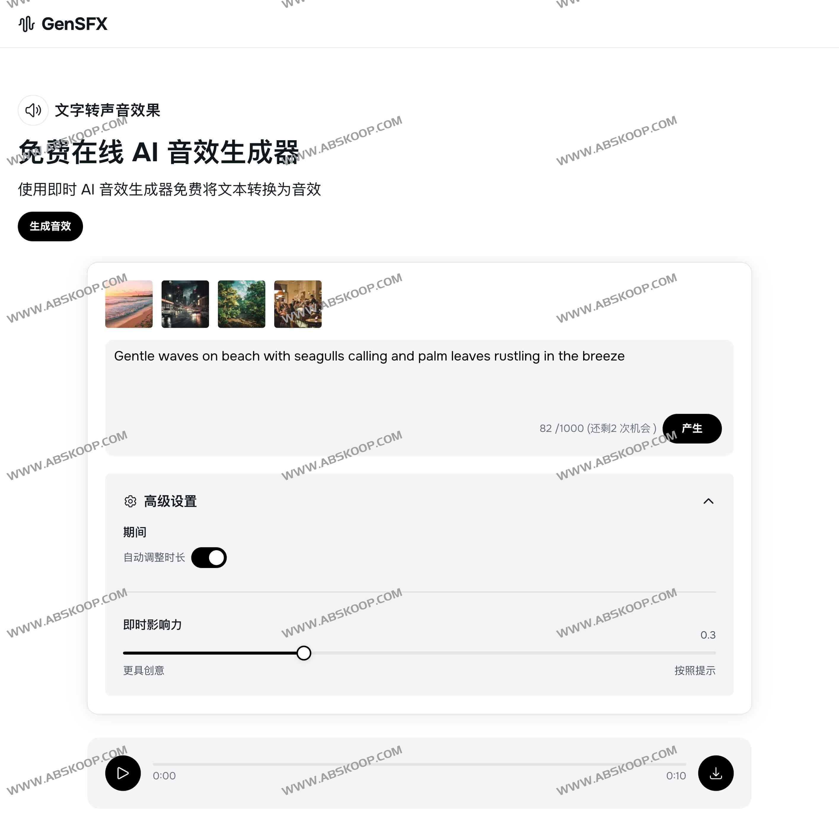 GenSFX是一款免费在线AI音效生成器,能够将文本描述快速转换为高品质音效,为创作者、游戏开发者和多媒体项目提供便捷的声音解决方案。基于先进的人工智能和音频合成技术,GenSFX可以精准解析用户输入的描述,生成环境、机械、自然、生物等多种类型的音效,并支持个性化调整,以满足不同场景的需求。用户无需注册即可使用,所有生成的音效均可免费下载并应用于个人或商业项目,确保创意实现的高效与自由。