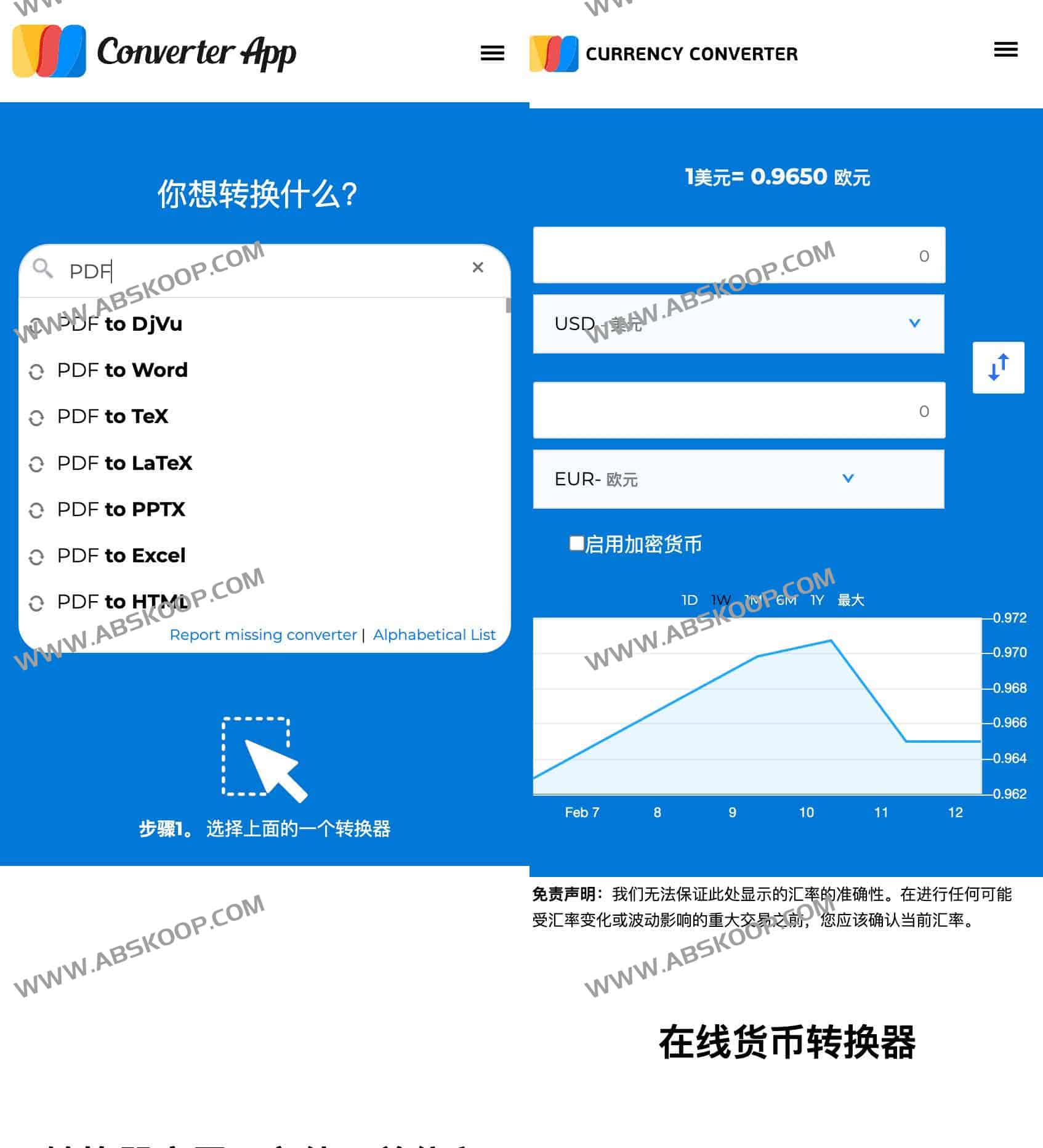 Converter App 是一款功能全面的在线转换工具,支持文件、单位和货币的免费转换。作为一款拥有超过10年经验的工具,它能够高效处理文档、图像、音频、视频等多种文件格式的转换需求,同时还提供科学单位转换和货币转换功能。其核心特点包括通用文件格式转换、音频转文本、视频格式调整、用户友好界面、快速处理能力以及严格的数据隐私保护。文件转换后会被立即从服务器删除,确保用户数据安全。此外,Converter App 还支持超过50种货币的实时汇率转换,并涵盖500多种加密货币,用户可通过图表追踪汇率历史变化。其单位转换功能覆盖公制、重量、能量、温度、压力等多种科学单位,界面设计直观高效。作为一款完全免费的工具,Converter App 无需注册,无隐藏费用,致力于为用户提供便捷、安全且高质量的转换体验。