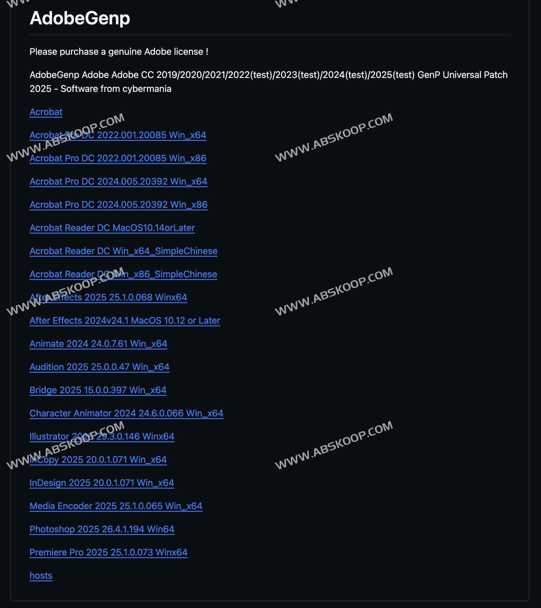AdobeGenp作为一款覆盖Adobe全家桶的解锁工具,能解锁Photoshop、Premiere Pro、After Effects等CC 2019至2025版本的专业功能。这款补丁适配Windows和MacOS双平台,从Acrobat文档处理到Media Encoder视频转码,几乎涵盖所有主流设计软件。用户通过修改系统hosts文件并运行补丁程序,即可绕过官方验证机制,GitHub是一个文件下载链接,下载文件复制地址打开即可下载对应的补丁,感兴趣的同学可以试试,有条件的同学可以支持正版。