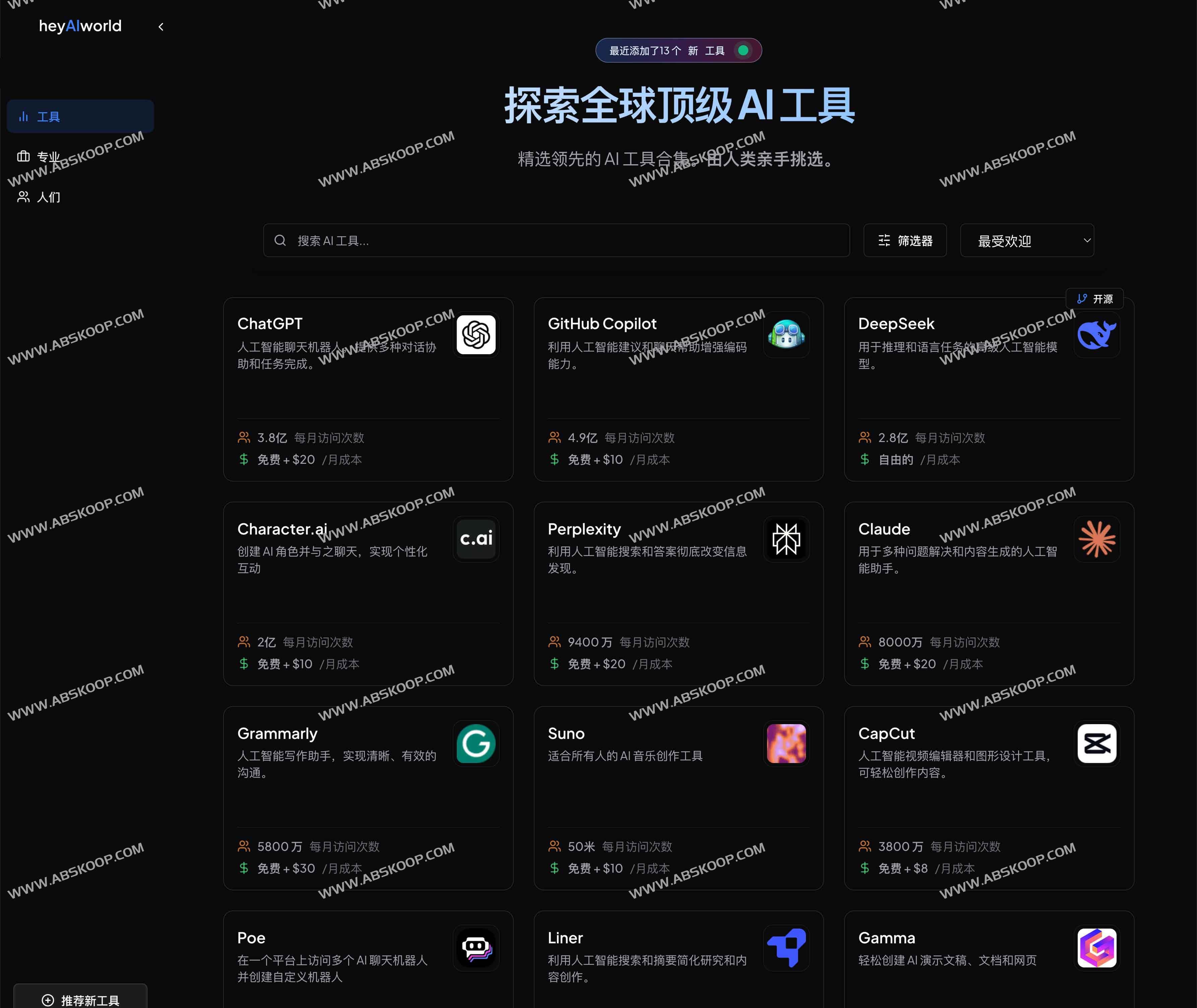 heyAIworld 是一个全球顶级 AI 工具的精选平台,所有工具均由专业人士精心挑选,涵盖从 ChatGPT、GitHub Copilot 到 Character.ai、Perplexity、Claude、Grammarly 等众多知名应用。平台提供按流行度、新旧程度和名称排序的多种筛选方式,让用户轻松找到最契合需求的 AI 工具,每款工具均详细展示月访问量和定价信息,涵盖免费、订阅及按使用计费等模式。借助 heyAIworld,你不仅能发现最新前沿的 AI 应用,还能在开发、设计、写作和视频编辑等多领域实现高效工作和智能转型,助你抢占科技创新的制高点。