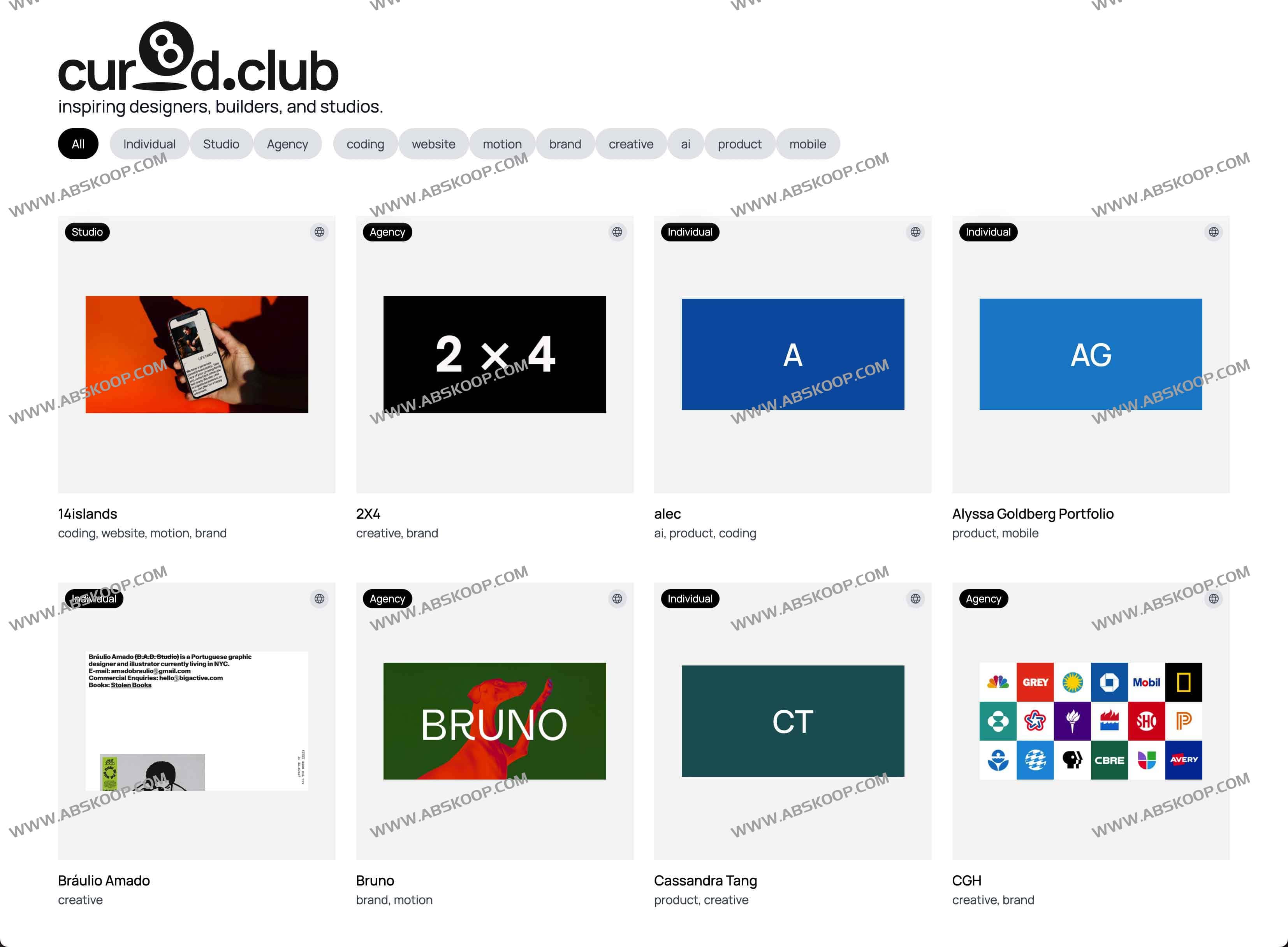 cur8d.club 是一个致力于为设计师、创作者和建筑师提供全方位创意资源导航的平台,这里汇聚了来自个人、工作室和代理机构的多样化作品与案例,覆盖编程、网站、动画、品牌、创意、人工智能、产品设计和移动设计等多个领域。平台上展示的优秀资源如 14islands、2X4、alec、Alyssa Goldberg Portfolio 等,代表了前沿设计和创新理念,为用户提供丰富灵感与实践指导,助力提升设计水平和品牌建设效率。cur8d.club 打造了一站式创意交流社区,使得设计师和创作者可以便捷查找灵感、探索前沿趋势,获得实用的创作参考,推动整个创意行业的发展。