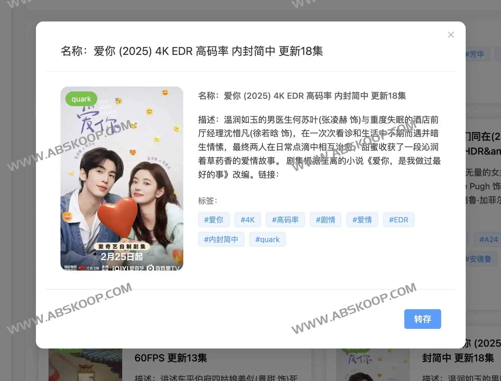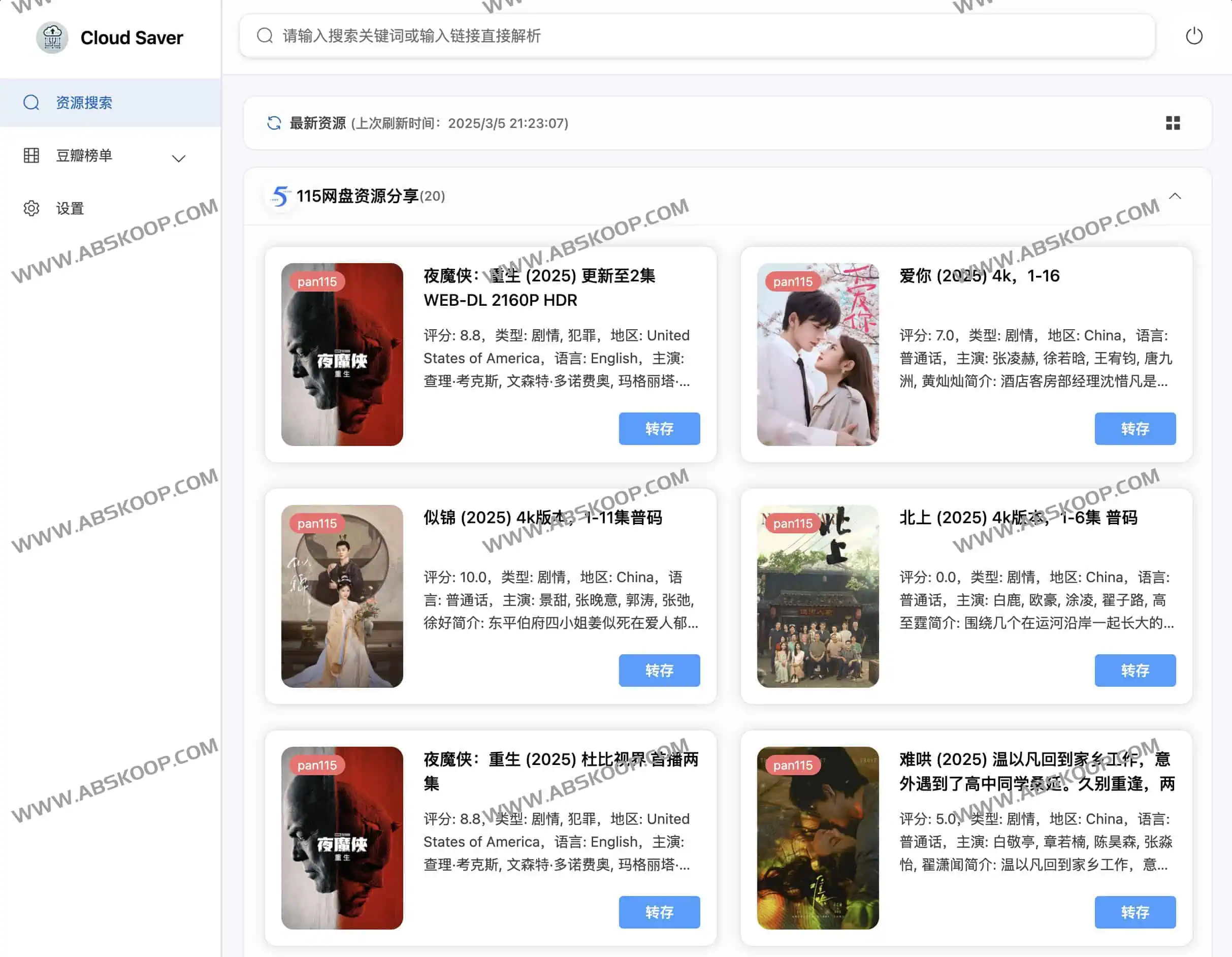 CloudSaver是一款利用Vue 3与Express构建的网盘资源搜索与转存工具,它为用户提供了一个高效便捷的资源管理平台,支持多源资源搜索、关键词查找与链接解析,并集成豆瓣热门榜单展示功能,实现资源的快速定位。该平台支持一键转存至115网盘和夸克网盘,并允许用户灵活选择转存文件夹,实现资源的有效管理。内置多用户系统可区分管理员与普通用户权限,保障数据安全。采用响应式设计,CloudSaver在PC和移动设备上均可提供优质体验,并支持通过Docker一键部署,简化运维流程。整个系统前端使用Vue 3、TypeScript、Vite、Pinia、Vue Router、Element Plus和Vant构建,后端采用Node.js与Express,数据存储则选用SQLite3,完美满足现代开发环境需求。