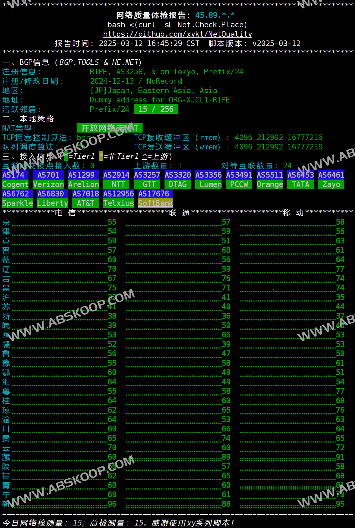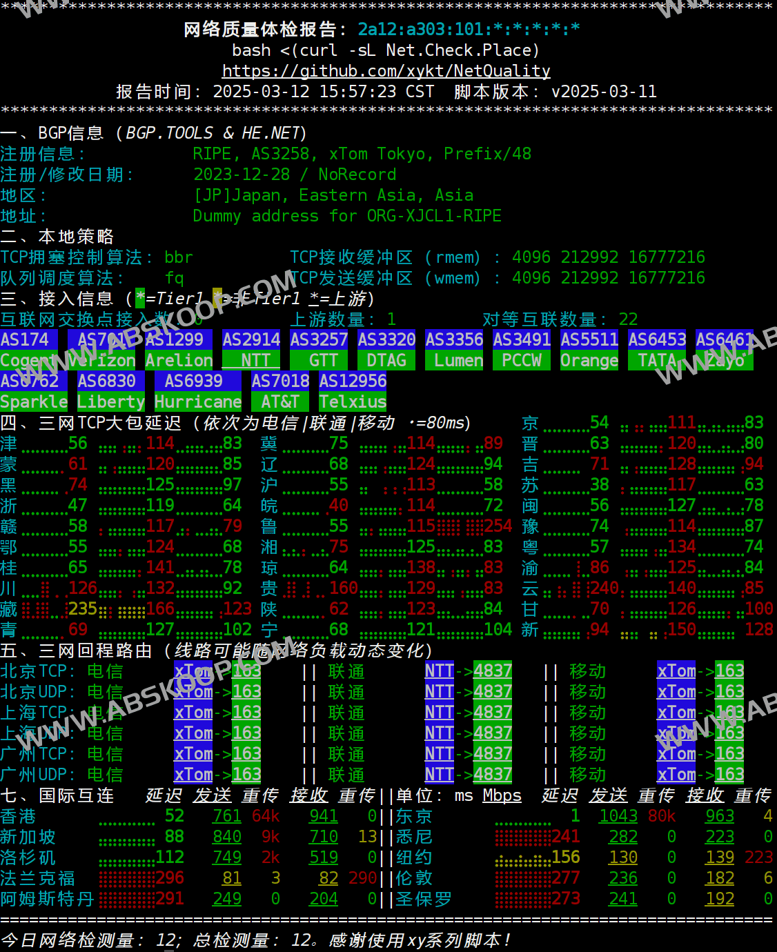 • BGP信息、本地策略、接入信息、三网TCP大包延迟、三网回程路由、国内测速、国际互连七大模块