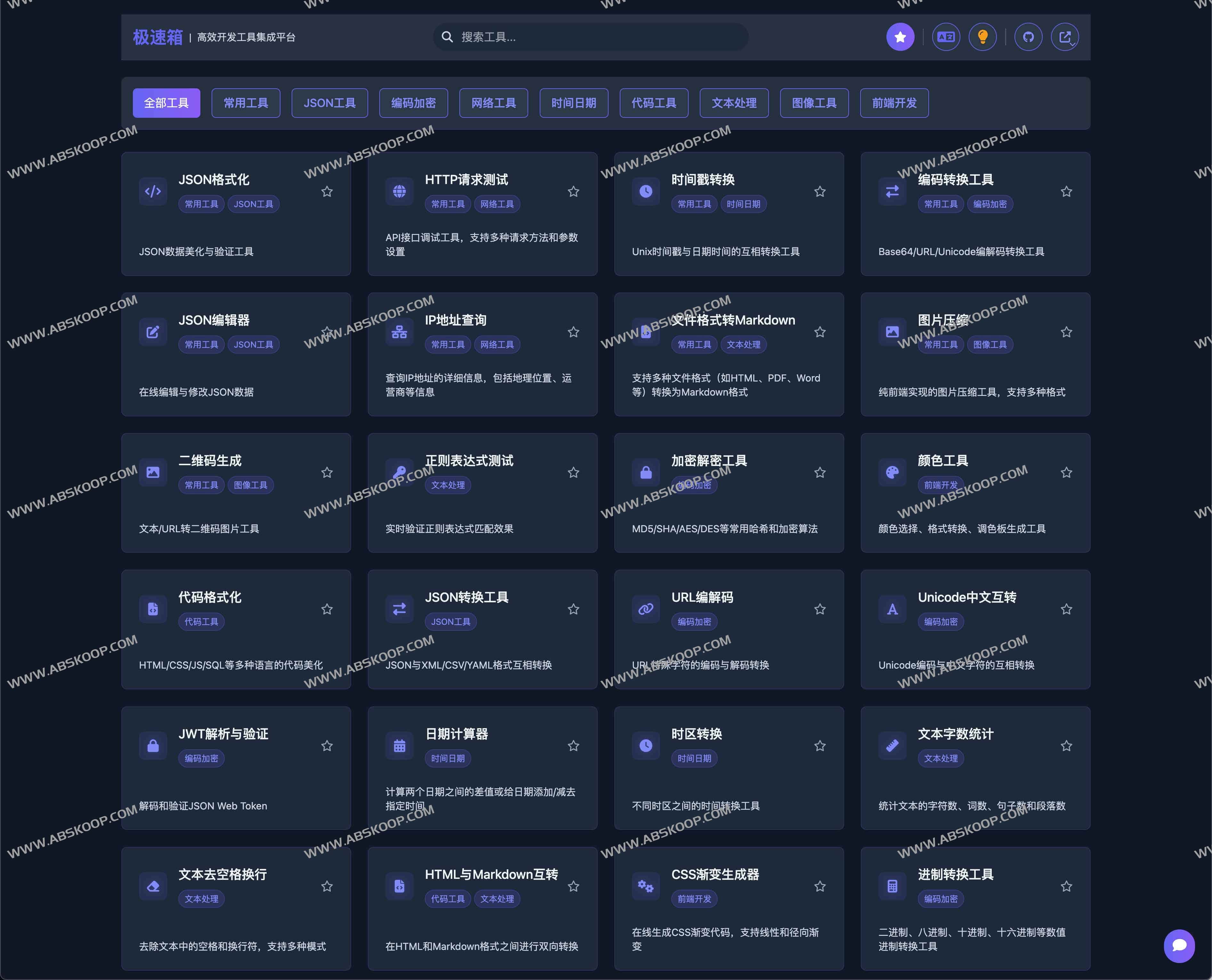 - 多种分类工具:JSON处理、编码解码、网络测试等多种实用工具