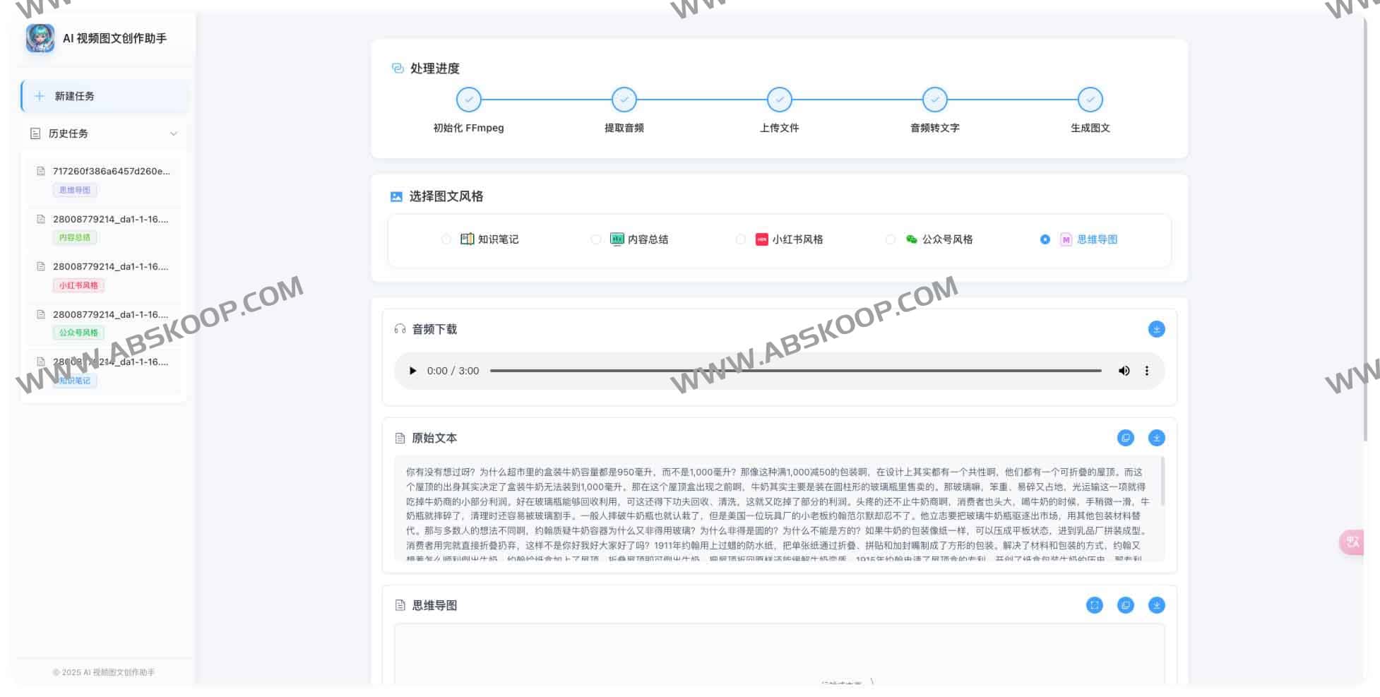 AI-Media2Doc是一款AI 视频图文创作助手,能够在无需登录注册、纯前端运行的前提下,将任意视频或音频内容,一键将视频和音频转化为小红书/公众号/知识笔记/思维导图等各种风格的文档。用户可在浏览器端直接处理音视频文件,并导出生成的思维导图到第三方平台进行进一步编辑和调整,无需任何付费或账号绑定。