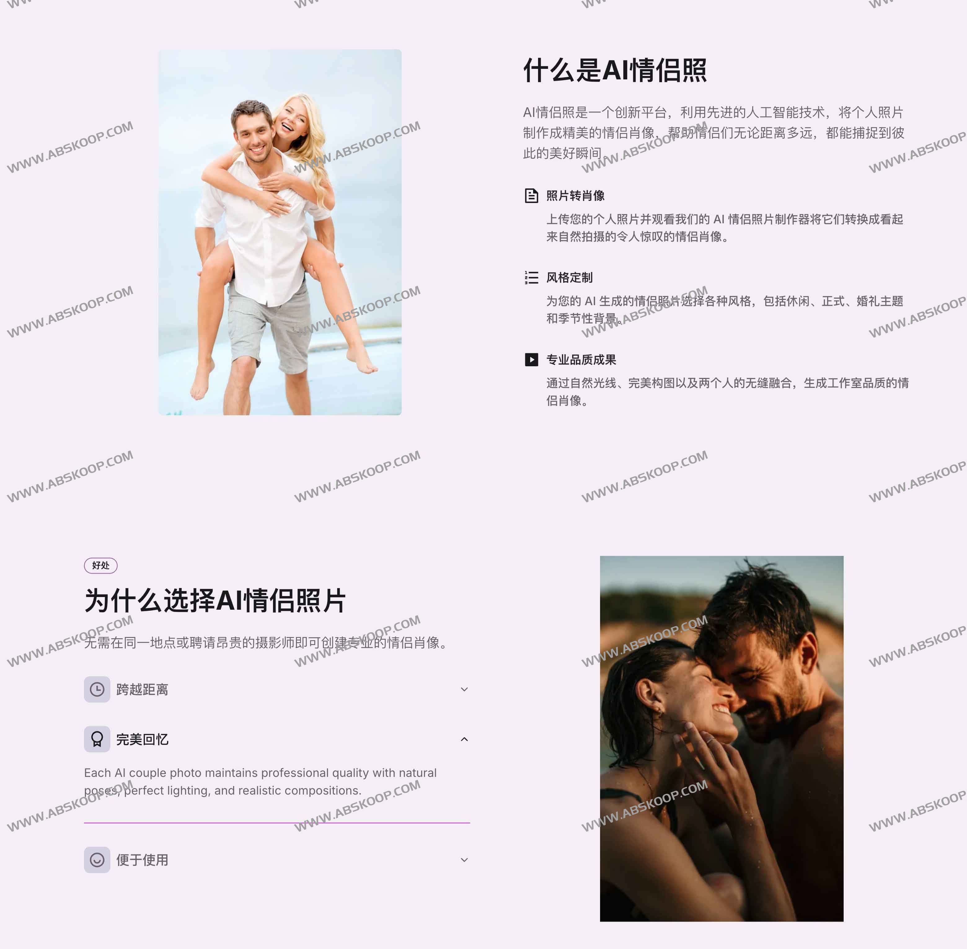 AI Couple Photo(AI情侣照)是一款基于前沿人工智能技术的在线照片生成服务,让用户只需上传个人照片,就能在几分钟内生成看起来自然、富有情感的情侣肖像。无论是异地恋伴侣想要共同留念,还是想在特殊场合添加创意元素,这款工具都能满足需求。平台操作门槛极低,不需要任何摄影或美工经验,只要上传、选择风格,其余过程都由AI自动完成。