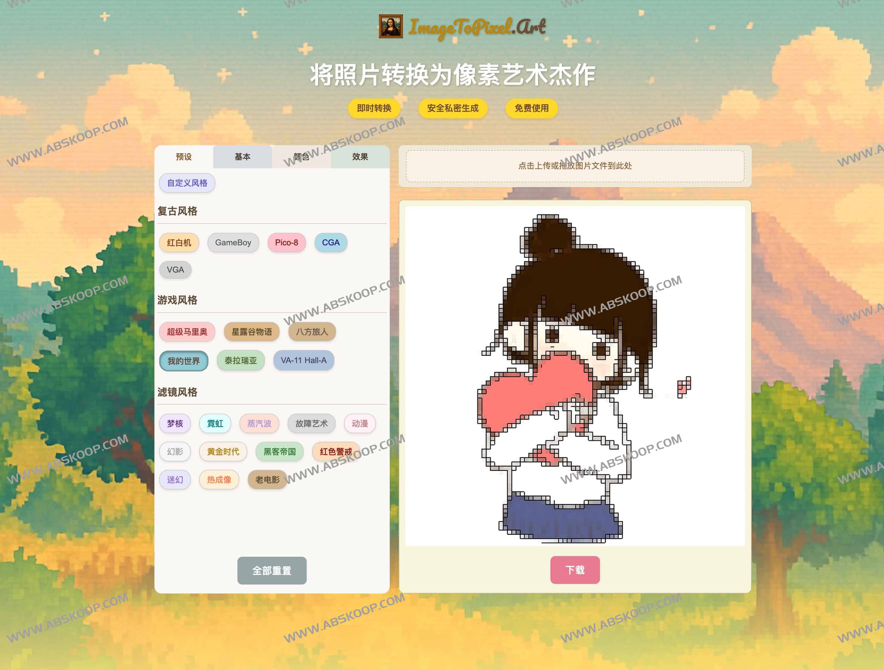 调整像素尺寸、色彩和效果,使用预设或深入手动设置,实现想要的像素风格。 - 下载