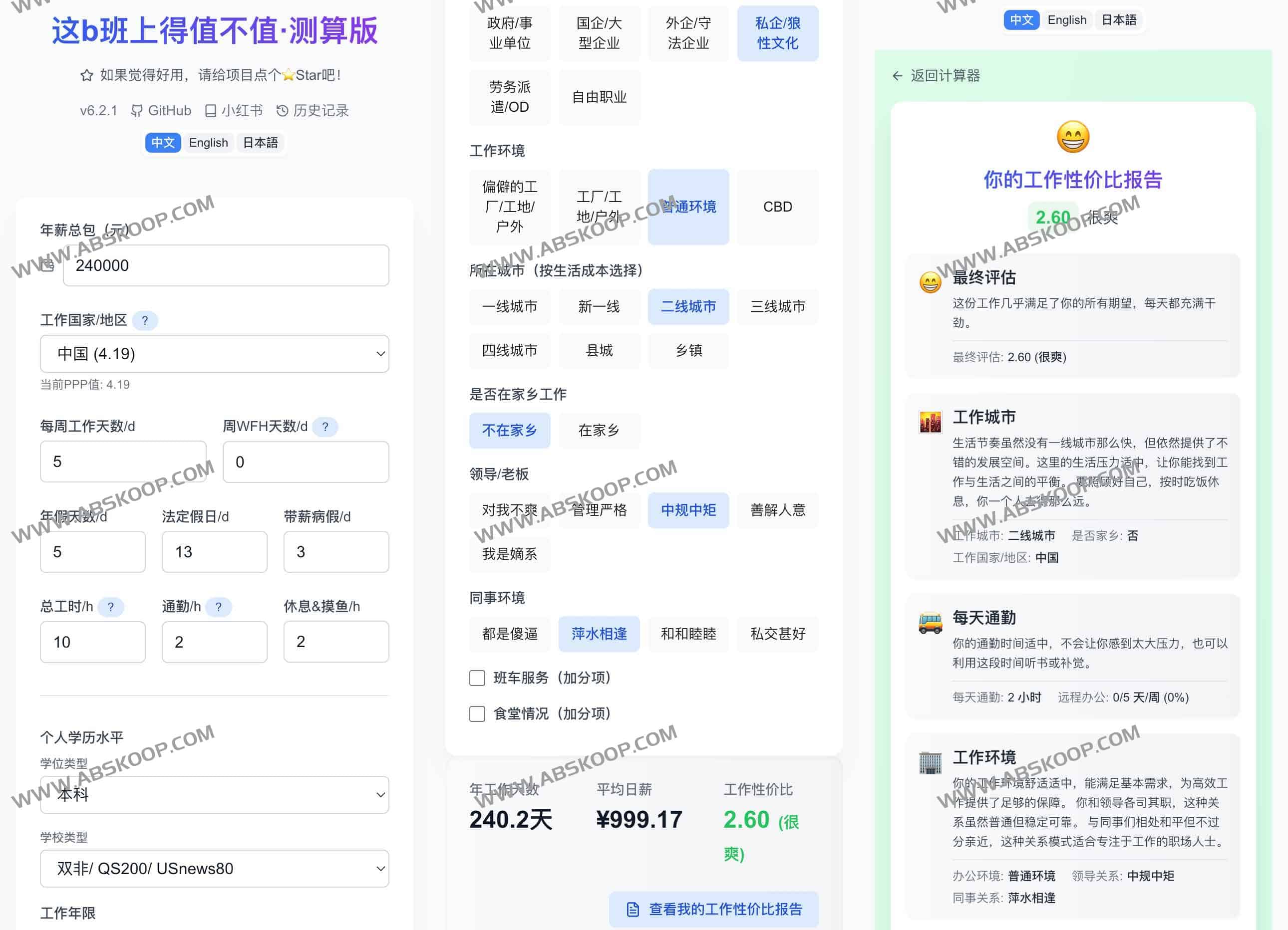 Job Worth Calculator是一款工作性价比计算器,帮你计算工作薪资到底值不值, 由开源团队 Zippland 打造,通过薪资、工时、通勤、工作环境等多维数据,再结合 190 多个国家的购买力平价(PPP)系数,输出标准化日薪与综合满意度评分,为个人职业决策提供量化依据。